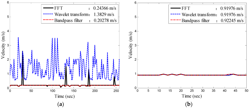 The optimal linear filtering theory, also called the Wiener filtering theory, was derived from the study of Kolmogorov [12] and Wiener et al. [13]. The greatest disadvantage of the Wiener filtering theory is that it requires data from the infinite past and it is not applicable for time series processing. To overcome this disadvantage, Kalman [14] introduced a state-space model in the filtering theory and deduced a recursive estimation algorithm called the Kalman filtering theory. Kalman filtering adopts the minimum mean square error as the optimum criterion to obtain a recursive estimation algorithm. It updates the estimation of the state variables by the estimated value at the last instance in time and the observed value at present with the state-space model of the signal and noise to obtain the estimated value at present. Another method similar to the Kalman filtering is the adaptive filter [15,16,17]; however, its filter coefficient can vary depending upon certain requirements at any given point in time. The adaptive filter is often adopted when the optimal coefficient of the digital filter cannot be determined. If an adaptive filter is adopted along with the noise elimination system, noise will inevitably be mixed with the signals received by the sensors [18]. Therefore, sometimes two sensors may be adopted for reducing the noise interference, with one mainly detecting the target signals and the other detecting the noise. When a surface current meter is placed on site, the space for storing the component information is limited; all of the above filters perform a significant number of calculations; hence, they are suitable for systems with a large storage space (such as computers). Therefore, this study compares the errors in the various methods used for estimating the surface velocity, via wavelet transform and a bandpass filter that calculate rapidly and do not depend upon previous measurement information, apart from the fast Fourier transform method, necessary for the calculations.