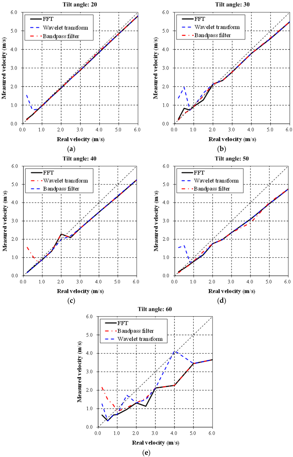 Comparison of the results of the flow velocity experimental analysis using the FFT, bandpass filter, and the wavelet transform. (a) Tilt angle = 20°; (b) Tilt angle = 30°; (c) Tilt angle = 40°; (d) Tilt angle = 50°; (e) Tilt angle = 60°.
