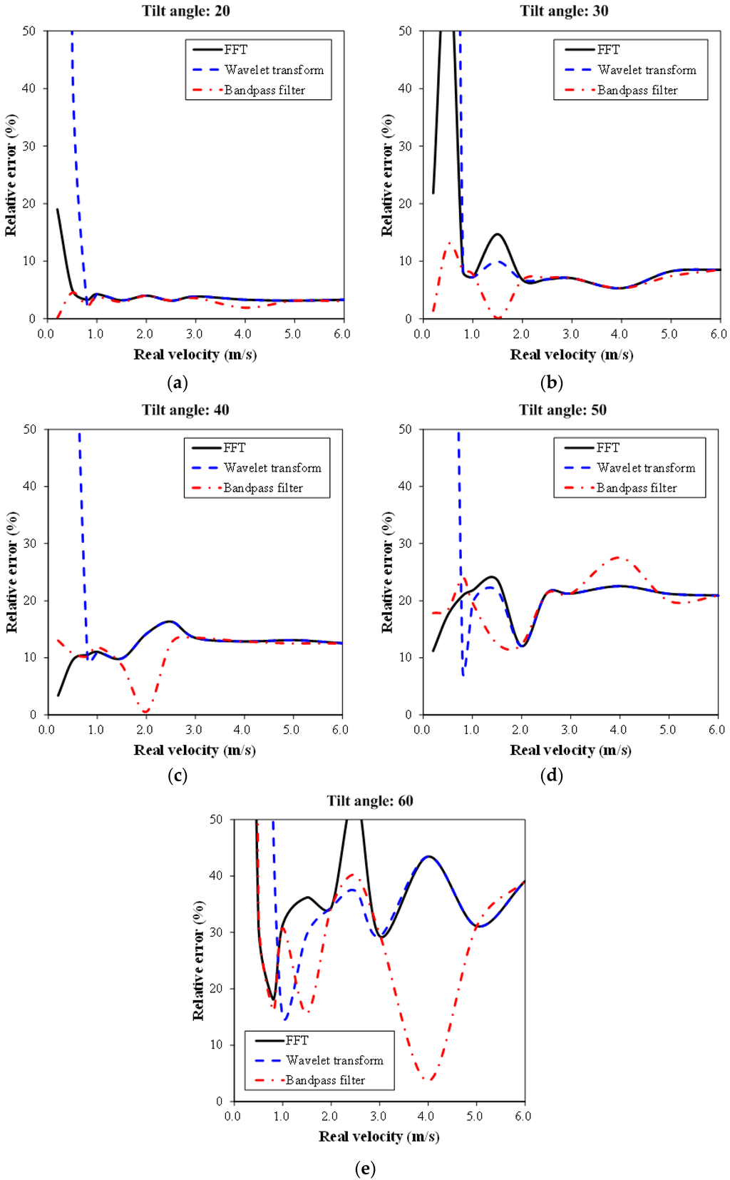 Comparison of the relative errors in flow velocity experimental analysis using the FFT, bandpass filter, and the wavelet transform. (a) Tilt angle = 20°; (b) Tilt angle = 30°; (c) Tilt angle = 40°; (d) Tilt angle = 50°; (e) Tilt angle = 60°.