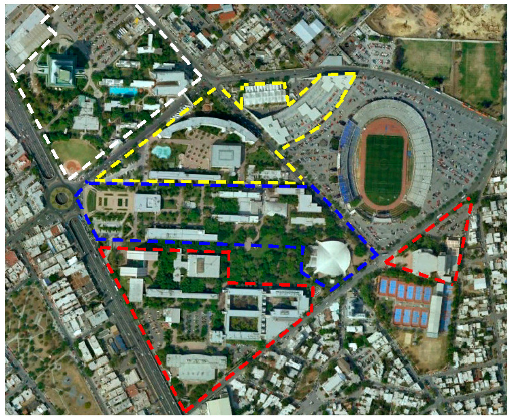 Monterrey Campus and clusters of catchment surfaces. In red, Group 1; in blue, Group 2; in yellow, Group 3; in blank, Group 4; Group 5 is not shown in the figure.