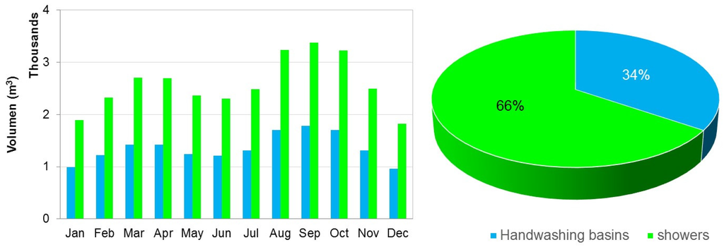 Figure 3 shows the monthly greywater generation of Monterrey Campus. As can be seen, showers were responsible of 66% of the greywater generation, while handwashing basins contributed 34%. Furthermore, two periods of lower generation were observed, in December and January, and from May to July, which correspond with the vacation periods of students. The greatest greywater generation from showers occurred from August to October, as a consequence of the high temperatures and humidity present in the region, which causes an increase of showering frequency. Handwashing basins generated approximately 16,556 m3/year, while the showers of gyms, swimming pool, and student dormitories produced 35,863 m3/year, totaling in 52,219 m3/year of greywater.