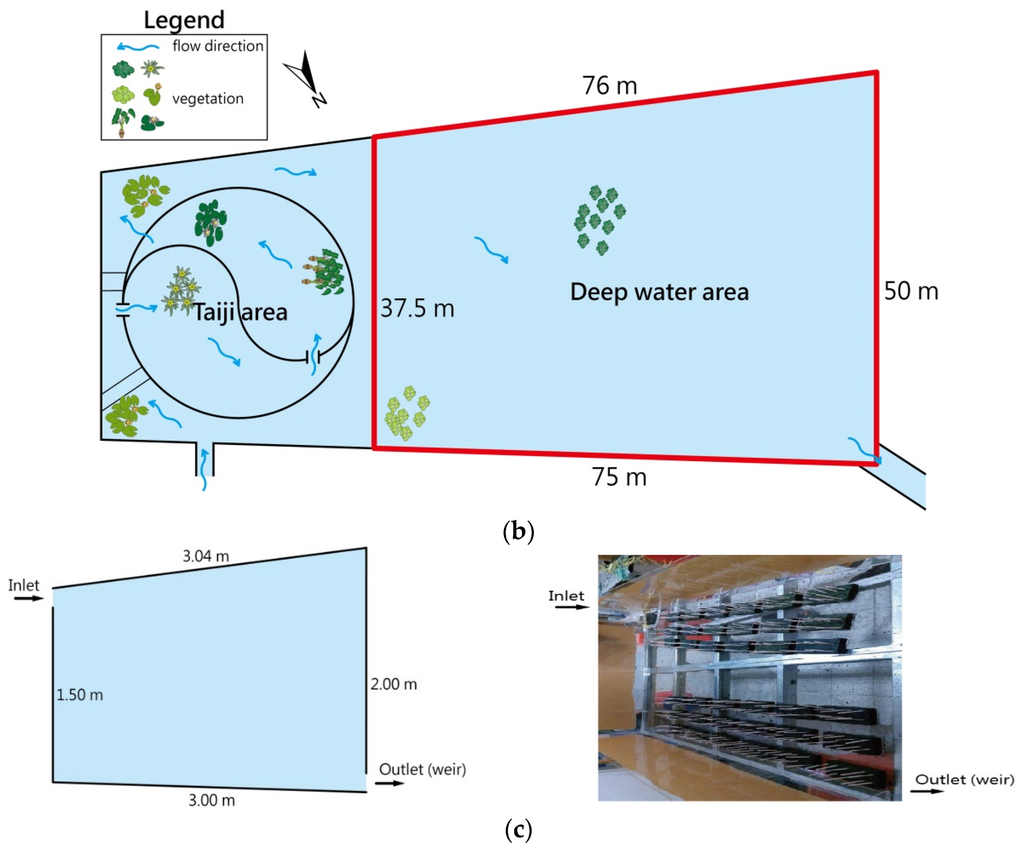 The study area was a farm pond located in Taoyuan County, Northern Taiwan (Figure 1a). The upstream section of the wetland was designed to hold shallow water with a meandering flow (called the Taiji area). The downstream section is a large area of deeper, open water, and it was suggested that the hydraulic performance of this deeper section could be improved [12]. In this study, we developed a flume experiment with tracer tests to study the effects of obstructions and vegetation on the hydraulic efficiency in the deeper downstream section.