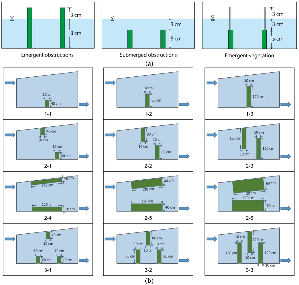 Figure 2. (a) Sizes and placement of emergent obstructions (EOs), submerged obstructions (SOs), and high- and low-density emergent vegetation (EV) in the side view. The heights of the EOs and SOs are 11 cm and 5 cm, respectively, which yield a protrusion and submergence of 3 cm above and below the water surface, respectively. The emergent vegetation was erected on the SOs and protruded above the water surface; and (b) configuration and dimensions of obstructions. In cases 2-4, 2-5, and 2-6 (high aspect ratio), the obstructions were 120 cm long by 20–60 cm wide. In the other cases (low aspect ratio), the obstructions were 40–120 cm long by 10 cm wide.