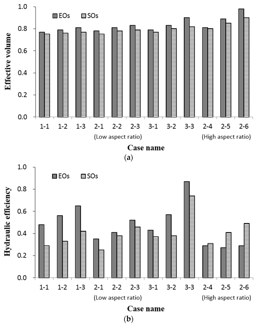 After the SOs were placed, the nominal retention time (tn) decreased linearly with increases in the obstruction volume. In the cases with low aspect ratios, the mean residence time (tm) increased with increases in the number and lengths of obstructions (Table 4). In the cases with high aspect ratios, although the volume percentage was somewhat higher, the effective volume ( e v ) increased with increases in the obstruction volume (Figure 4a). In the cases with low aspect ratios, the hydraulic efficiency (λ) increased as the number and lengths of obstructions increased, although, this effect was not highly significant (Figure 4b). The majority of the λ values were less than 0.75, representing poor hydraulic efficiency. The nominal retention time (tn) decreased linearly with increases in the obstruction volume. In the cases with low aspect ratios, the EOs yielded significantly greater improvements in hydraulic efficiency (λ) than did the SOs (Figure 4). In contrast, in the cases with high aspect ratios, the EOs yielded less improvement than did the SOs. The high-aspect-ratio EOs clearly altered the flow direction and constrained the water conveyance area more than did the low-aspect-ratio EOs, and this greater alteration may have caused the short-circuited flow. The short-circuited flow occurred in the areas with relatively high flow speeds, caused by lower friction and constrained conveyance water area. This creates a non-uniform flow condition, resulting in a decrease in the residence time and hydraulic efficiency, which also prevents a wetland from improving the water quality.