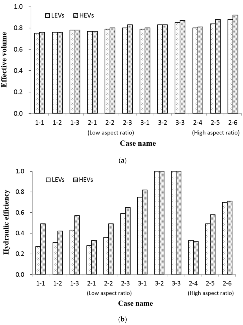 We installed HEV and LEV on the SOs. The tracer recovery rates associated with the HEV and LEV were approximately 54% and 60%, respectively. The nominal retention time (tn) associated with the HEV decreased linearly with increases in the obstruction volume. The mean residence time (tm) increased with increases in the quantities and lengths of the emergent vegetation installations (Table 5). The effective volume ( e v ) increased with increases in the volumes of the emergent vegetation (Figure 5a). In the cases with low aspect ratios, the hydraulic efficiency (λ) increased with increases in the lengths of the emergent vegetation installations and with increases in the quantity of the emergent vegetation (Figure 5b). In cases 3-1, 3-2, and 3-3, λ increased to 0.75 or more, representing good hydraulic efficiency. In the cases with high aspect ratios, λ increased with increases in the lengths of the emergent vegetation installations on both sides. However, the improvement in efficiency was less significant than that associated with the low aspect ratios; λ reached a value of 0.5 or higher, representing satisfactory hydraulic efficiency.