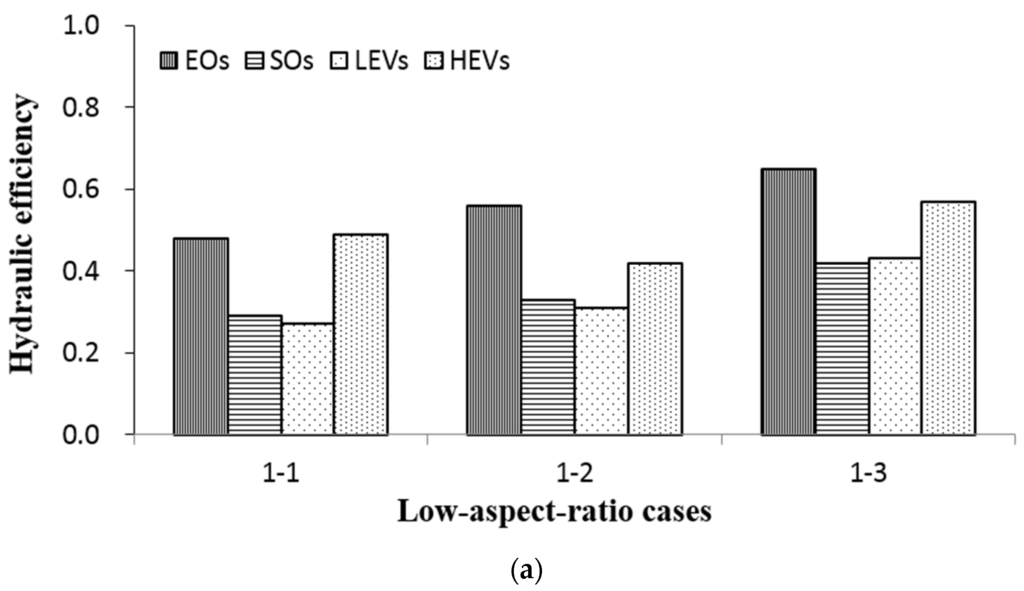 Figure 6 presents a comparison of the hydraulic efficiency (λ) associated with various placement configurations of the obstructions and emergent vegetation. In the cases with low aspect ratios with placements involving smaller surface areas and quantities (such as cases 1-1, 1-2, and 1-3), the λ values associated with the EOs were clearly superior to those associated with the other placements. In the placements involving larger surface areas and quantities (such as cases 2-1, 2-2, 2-3, 3-1, 3-2, and 3-3), the λ values associated with the emergent vegetation were higher than those associated with the obstructions. In the cases of high aspect ratios, the λ of the EOs was the lowest because the EOs altered the directions of flow. Since the placements differed, it was easier for short-circuited flow to occur. In the cases with high aspect ratios, the emergent vegetation was more effective in increasing the hydraulic efficiency. The λ values associated with the SOs were all less than those associated with the emergent vegetation. The differences between the λ values were larger in the placements involving larger surface areas and quantities. The improvements associated with the HEV were all better than those associated with the LEV. In the cases with high aspect ratios (cases 2-4, 2-5, and 2-6), increasing the lengths of the EOs on both sides did not improve the hydraulic efficiency.