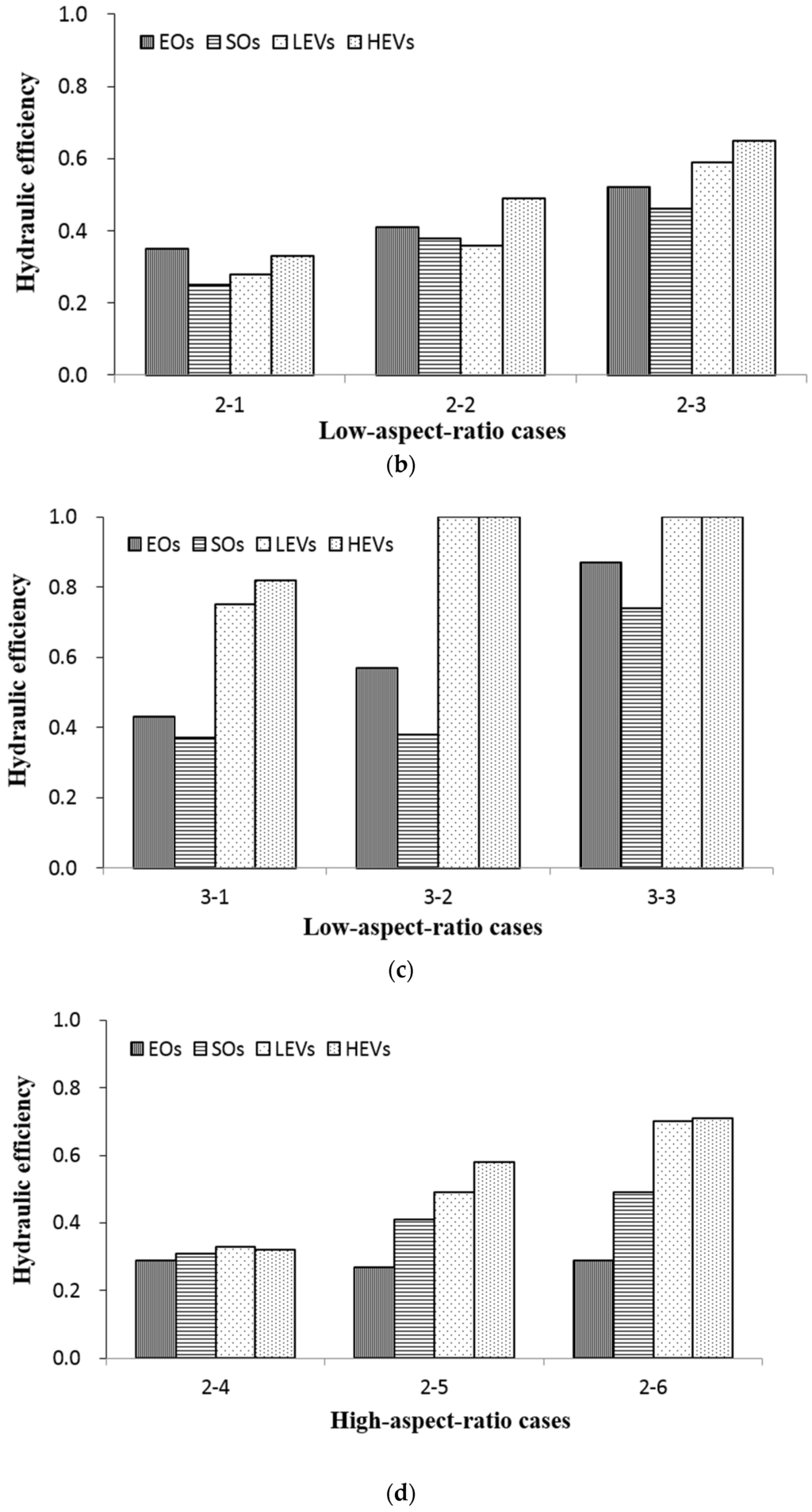 Figure 6. Hydraulic performance of (a) low-aspect-ratio cases 1-1, 1-2, and 1-3; (b) low-aspect-ratio cases 2-1, 2-2, and 2-3; (c) low-aspect-ratio cases 3-1, 3-2, and 3-3; and (d) high-aspect-ratio cases 2-4, 2-5, and 2-6 with emergent obstructions, submerged obstructions, and high- and low-density emergent vegetation.