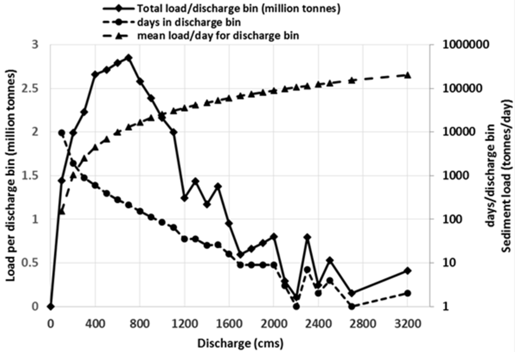 One method for determining the effective discharge is the Wolman–Miller Model [15], which Powell et al. [11] illustrated for the Maumee River in Ohio at a United States Geological Survey (USGS) gauge having a catchment area of 16,395 km2 (Figure 1). In this study, 43 years of discharge and suspended-sediment data were divided into 100-m3/s discharge ranges (bins) starting with 0 to 100 m3/s, 100+ to 200 m3/s, 200+ to 300 m3/s, and so forth until a final bin was made that contained all data for discharges larger than 2700 m3/s. The total sediment load per bin (solid line) was the product of the two dashed lines (days in a particular bin multiplied by the average daily load for discharges in the bin). Low discharges were ineffective in transporting sediment, and extreme events had very high sediment transport rates but occurred infrequently so the total sediment load they carried over a period of many decades was not the bin with the largest average discharge.