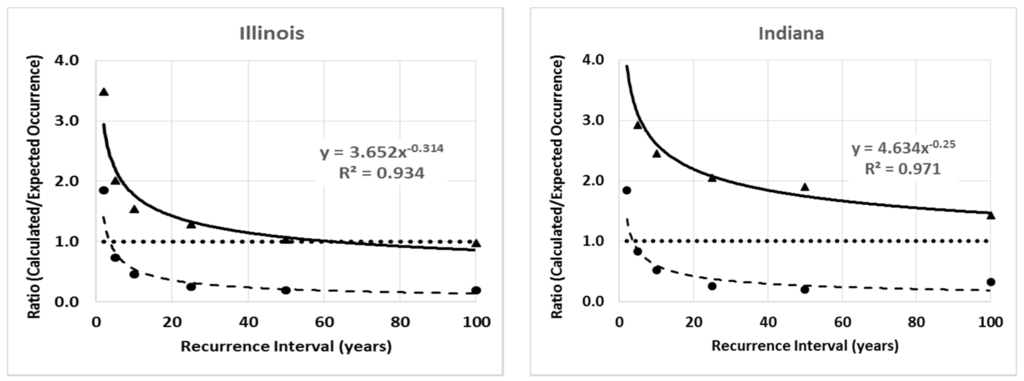 Based on an annual series of peak daily means, the ratio of the calculated to the expected mean number of occurrences were highly correlated to the recurrence interval with the exception of the results for Ohio (R-squared = 0.64, see Figure 3). However, when the state-to-state or catchment-to-catchment variability was considered (Figure 3) the correlation was too low for scientific purposes. The analysis based on discharges 25% larger or smaller than those obtained from the Log-Pearson Type 3 analysis indicated that the discharges were generally unlikely to be much smaller or larger than the calculated values.