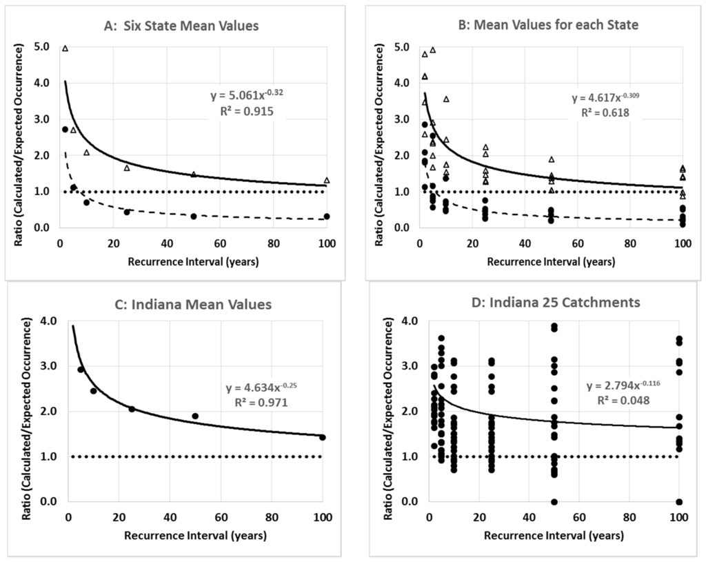 For the Log-Pearson Type 3 approach, the ratio of the calculated versus expected occurrences based on the mean discharge of all 150 catchments evaluated (A); and the mean discharges for the 25 catchments in each state (B). Solid circles and dashed lines are associated with occurrence ratios based on 125% of the discharges calculated with the Log-Pearson Type 3 analysis. Also shown is the ratio of the calculated versus expected occurrences based on the mean discharge for the 25 catchments evaluated in Indiana (C) and the ratios determined with the discharge for each of the 25 catchments evaluated in Indiana (D).