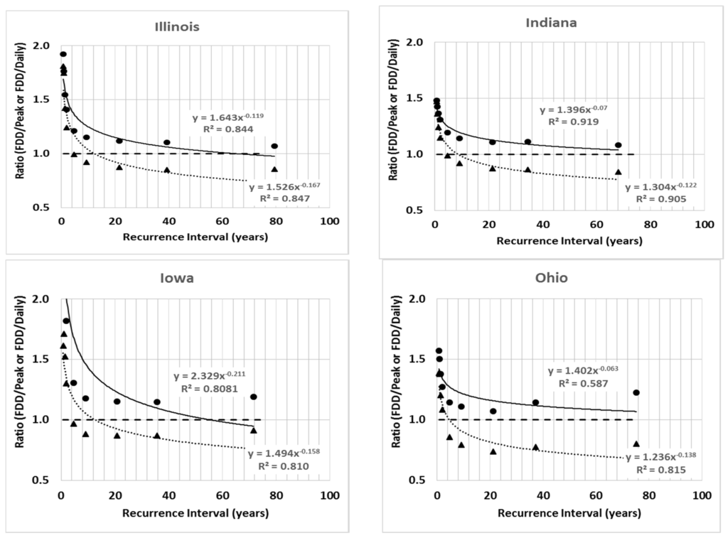 A summary of the calculated number of daily occurrences in a 100-year time period for different recurrence interval discharge is shown in Table 3. The large standard deviations for all states and all recurrence intervals were an indicator of the large variability between catchments. For example, the range in the daily occurrences in 100 years, for the two-year recurrence interval discharge, were 77–382, 62–748, 110–834, 83–254, 102–612 and 97–1854 times for Illinois, Indiana, Iowa, Ohio, Wisconsin and Minnesota, respectively.