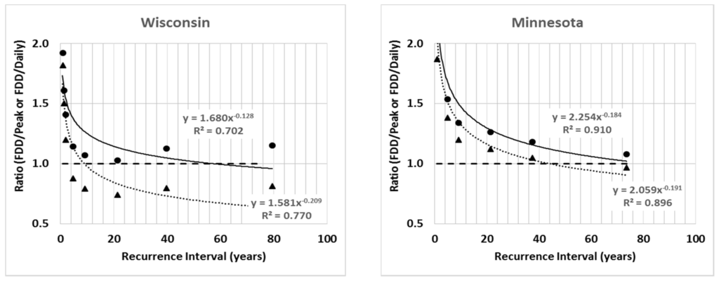 Recurrence Interval versus discharge ratios of the full daily distribution (FDD) discharges to those based on an annual series of instantaneous peaks (Peak) and an annual series of peak mean daily discharges (Daily)—based on an analysis of mean results for the six states. Also reported are ratios of the mean daily peaks to the instantaneous peaks. Standard deviations are reported in parentheses.