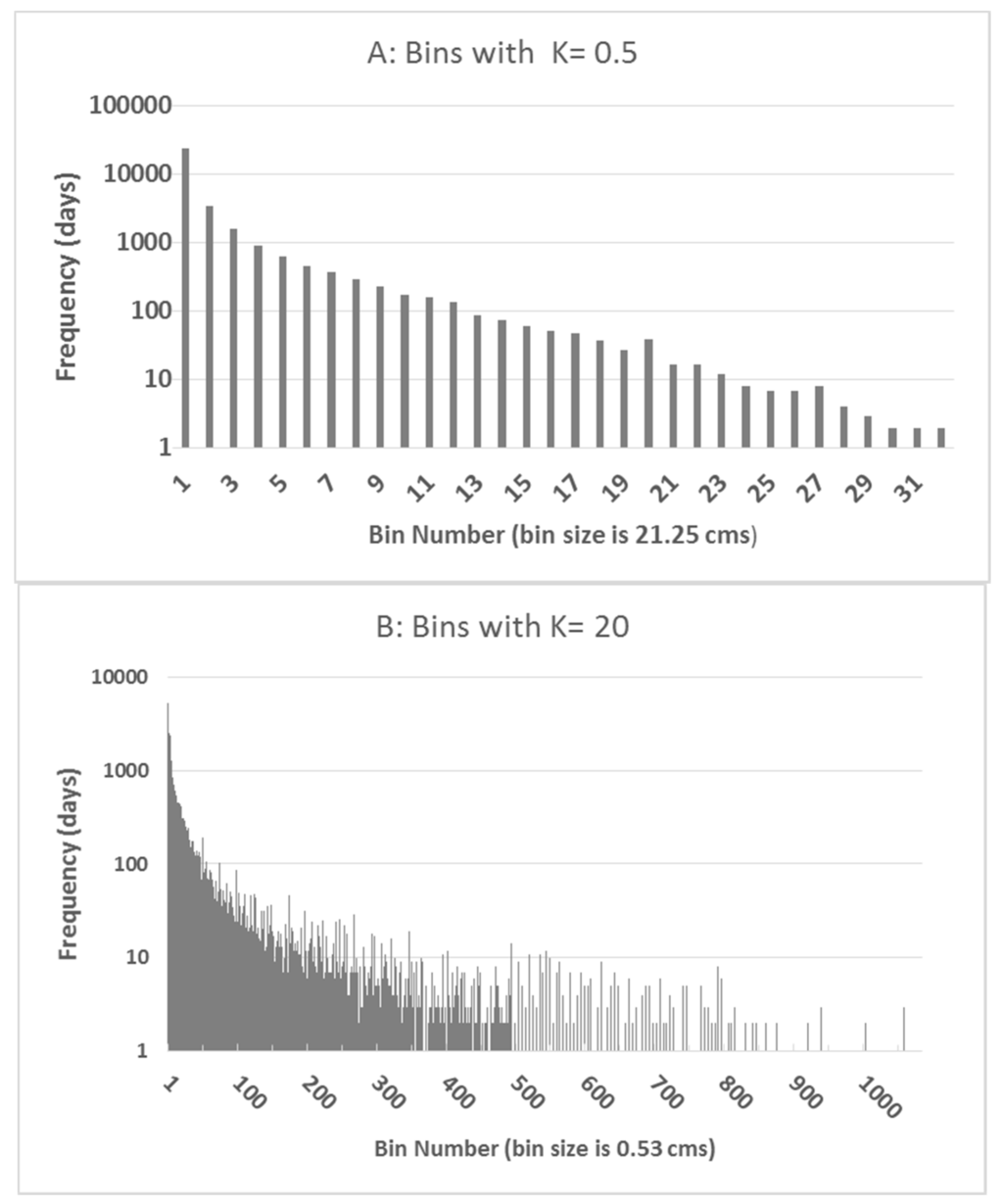 Histograms with K = 0.5 (A) and K = 20 (B) for the Sandusky River, near Fremont Ohio. A bin with a bin number of 1 has all discharges less than 21.25 m3/s (K = 0.5) and 0.53 m3/s (K = 20). A bin with a bin number of 10 (K = 0.5)) contains discharges between approximately 229.0 and 229.07 m3/s. A bin with a bin number of 400 (K = 20) contains discharges between approximately 229.07 and 229.64 m3/s.