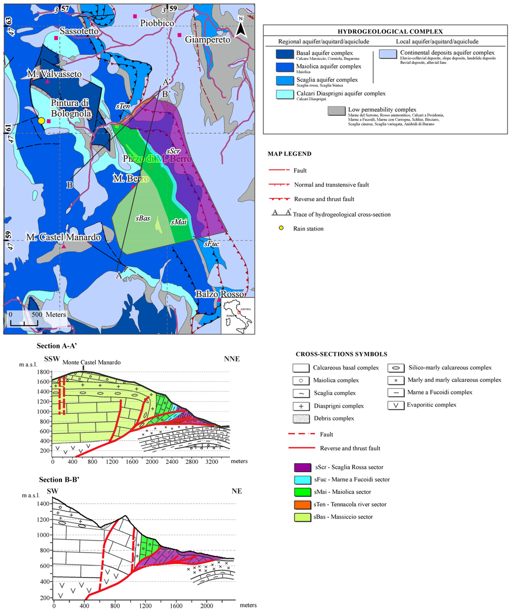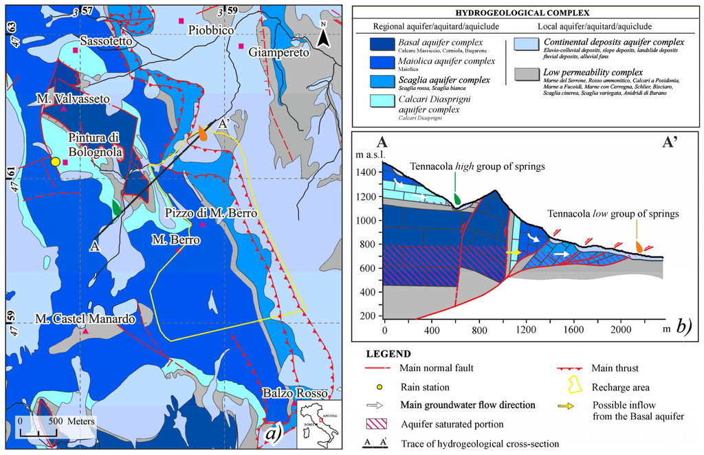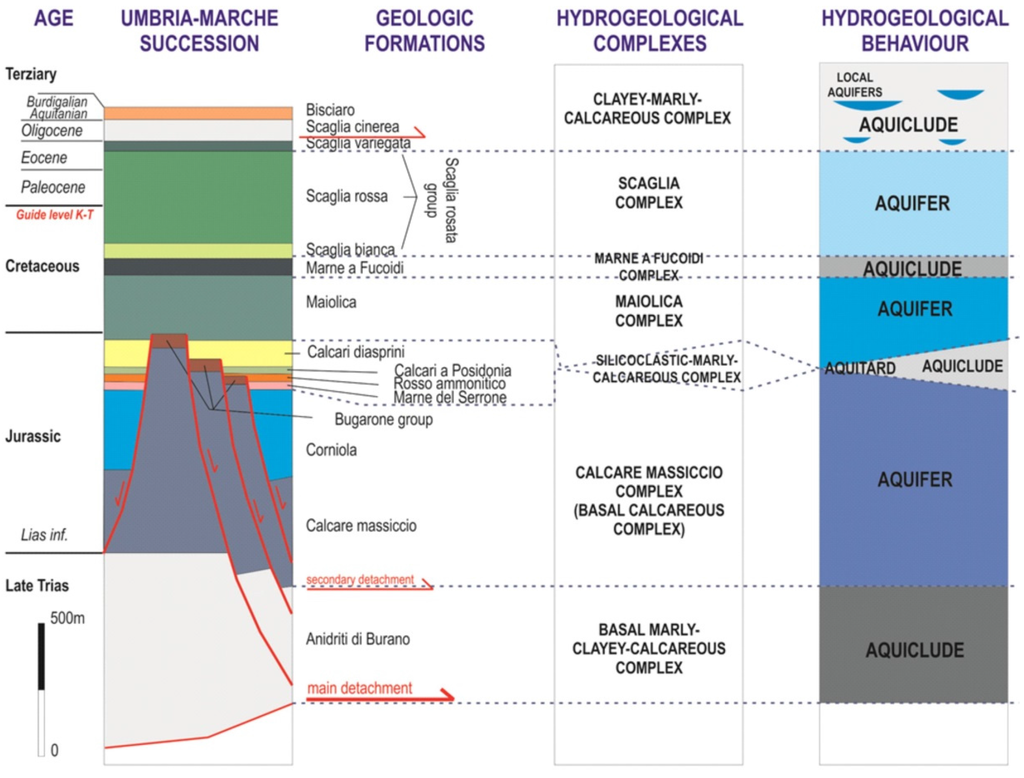 The main aquifer is comprised of the Maiolica and Scaglia formations; the Marne a Fucoidi formation, which is usually interposed between them, was not detected during the monitoring, probably because it has been partly erased by the thrust. For this reason, here it must be considered as an aquitard that produces a general delay in the flow of groundwater to the springs.