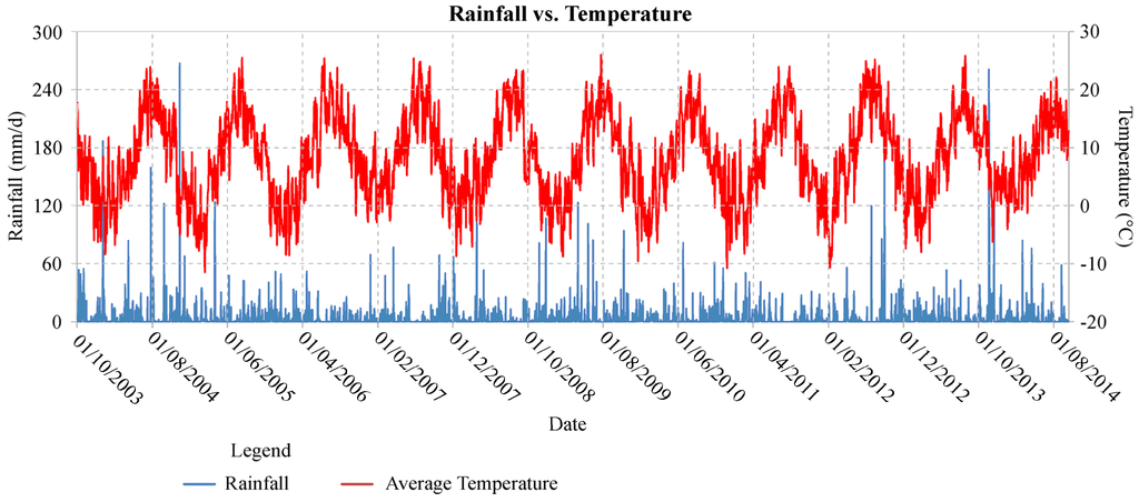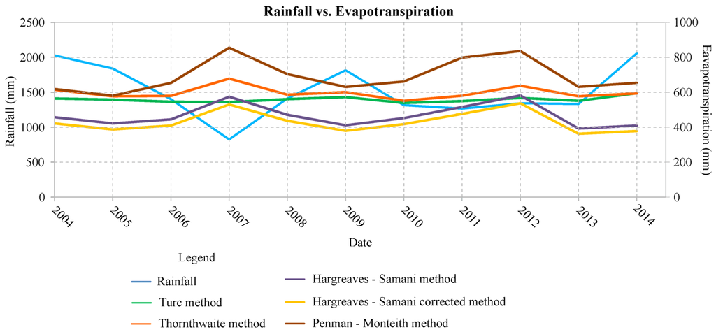 Evapotranspiration compared with the rainfall data for the period 2004–2014.