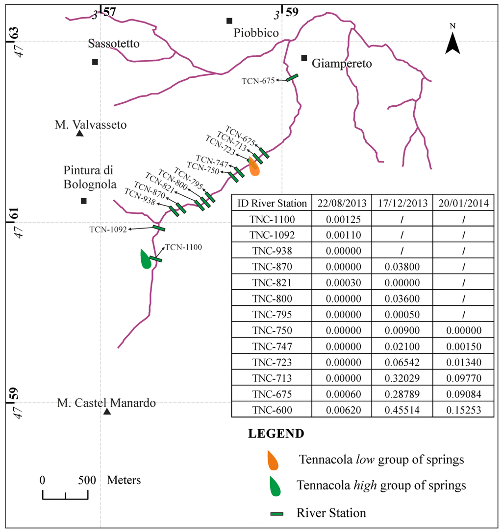 Three measurement campaigns were conducted by the University of Camerino along the Tennacola stream between August 2013 and January 2014 in order to monitor the river discharge during the dry and wet seasons (Figure 4). For the monitoring, 16 measuring stations were used that were evenly distributed from 1100 and 600 m a.s.l., which corresponded to the highest and lowest group of analyzed springs. The data collected during the summer periods (August 2013) showed that the river became nearly dry along the investigated reach. In fact, only limited sectors of the river (a few tens of meters) had discharges of 0.002–0.003 m3/s that, however, were suddenly absorbed by the large thicknesses of the coarse materials (pebbles and blocks) that form the riverbed. Slightly more significant discharges (approximately 0.006 m3/s) were recorded at the lowest station, which was located at an altitude of 600 m a.s.l. These conditions certainly persisted until the first half of October when, during the periodical surveys, no significant changes were observed.