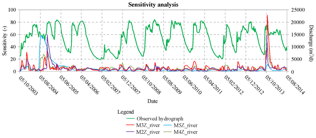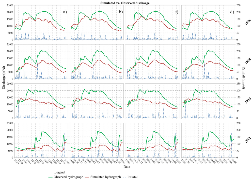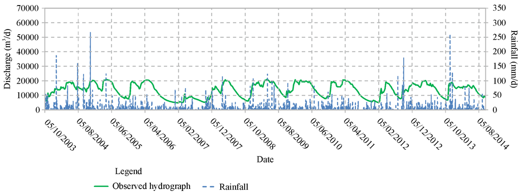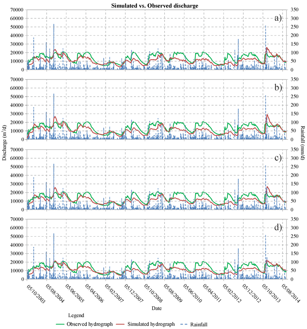 The detailed analyses carried out for single hydrologic years (Figure 10) instead showed good approximations of the hydrograph shape (discrete spatial distribution of the hydrogeological parameters); nevertheless, the simulated discharge showed a general underestimation in the observed discharge of approximately 1,500,000 m3/year on average (Table 6).