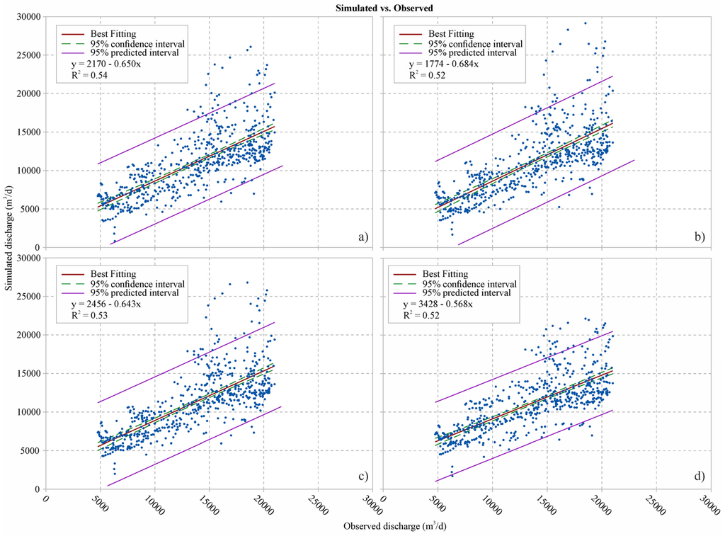 Based on the aforementioned analyses, it was possible to evaluate the goodness of the proposed models (Table 5). The variance, which was less than 1 in all of the considered models, indicates a good correspondence; the lowest value, in particular, corresponds to the model with two zones and a limited number of adjustable parameters. On the contrary, R, which was constant for all of the models, is apparently lower than the recommended value [66]. This result was also confirmed by the scatterline graph, in which the slope of the best-fit line was different than 1 (Figure 11). Even the simulated hydrographs (Figure 9) for all of the models had average errors from 0.038 and 0.040 m3/s, which were too high with respect to the observed discharges at the springs. The error is comparable among the models but slightly increases with the number of zones (and consequently with the number of adjustable parameters); this is due to the problem of equifinality, in which increasing the parameter space can increase the number of optimum solutions available and reducing the performance of all “optimums” [67]. As a consequence, the model with two zones and a low number of adjustable parameters remained the most suitable among the models investigated in relation to the available data. The analysis of the AIC, BIC and KIC parameters confirmed these results.