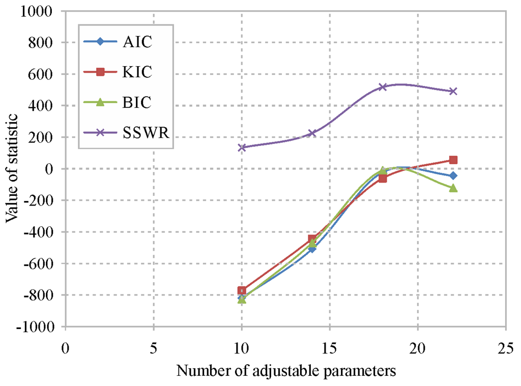 The analysis was conducted by increasing the number of zones in the model domain and consequently the number of adjustable parameters, and statistical index and information criteria were calculated for each model under consideration.
