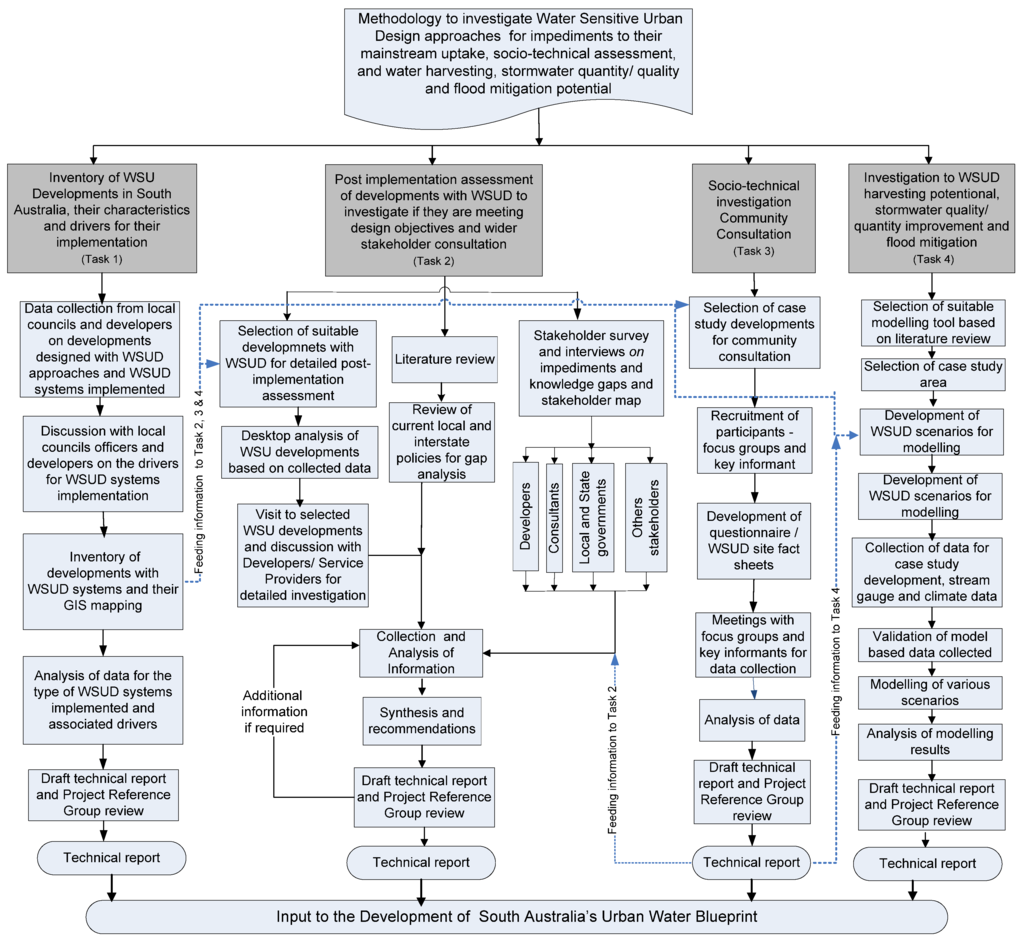 This paper describes a methodology and its application for the investigation of impediments to the uptake of WSUD systems in Greater Adelaide, South Australia (population 1.2 million). The project also explored community perceptions of WSUD systems and the potential of WSUD to meet local objectives for water harvesting, stormwater quantity management and flood mitigation. Broad outcomes of this study have been included in this paper. Various task specific publications from this multi-activity large study have also been developed. The project has applied an evidence-based process to evaluate the effectiveness of WSUD in achieving implementation objectives, and to identify the knowledge gaps and other impediments that are hindering greater mainstream uptake of WSUD approaches in South Australia. The methodology presented in this paper will benefit water professionals across the globe engaged in the implementation of IUWM and WSUD approaches for sustainable urban water servicing. It will particularly benefit those interested to understand their harvesting and flood mitigation potential and the barriers to increased uptake of these systems.