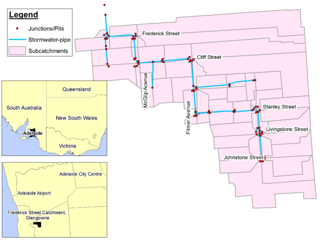 Some of the measures in the above last option are currently being implemented in South Australia and other Australian states. According to South Australian regulations in the Australian Building Code [27], it is currently mandatory for all new dwellings and some additions to include an alternative water supply to supplement the mains water supply system. In the absence of a recycled water supply, this is typically achieved by implementing a minimum one kilolitre rainwater tank. Some local governments have additional stormwater detention policies. These require a development to detain stormwater on site using storages in such a way that a specified volume of runoff is collected, stored and allowed to drain away through an orifice of specified size. These tanks are designed to capture the initial volume of runoff during a rainfall event to reduce the peak flow rate of stormwater runoff. This body of work is being conducted to assess the ability of WSUD based retention and detention mechanisms to extend the life of existing stormwater infrastructure.