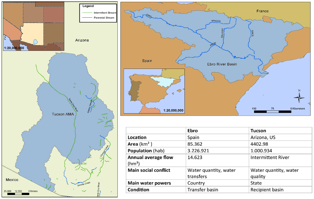 This study is a part of the Sustainable Water ActioN (SWAN) project, whose primary objective is the exchange of knowledge among researchers in the United States and European Union on water management issues. This partnership provided the authors with the opportunity to jointly analyze the stakeholder engagement in water planning in the Ebro River Basin and the Tucson Basin. This assessment is focused on participation in the First River Basin Management Plan (RBMP) of the Ebro Basin after the approval of the Water Framework Directive (WFD), and the Third Management Plan of the Tucson Active Management Area (TAMA) (Figure 1).
