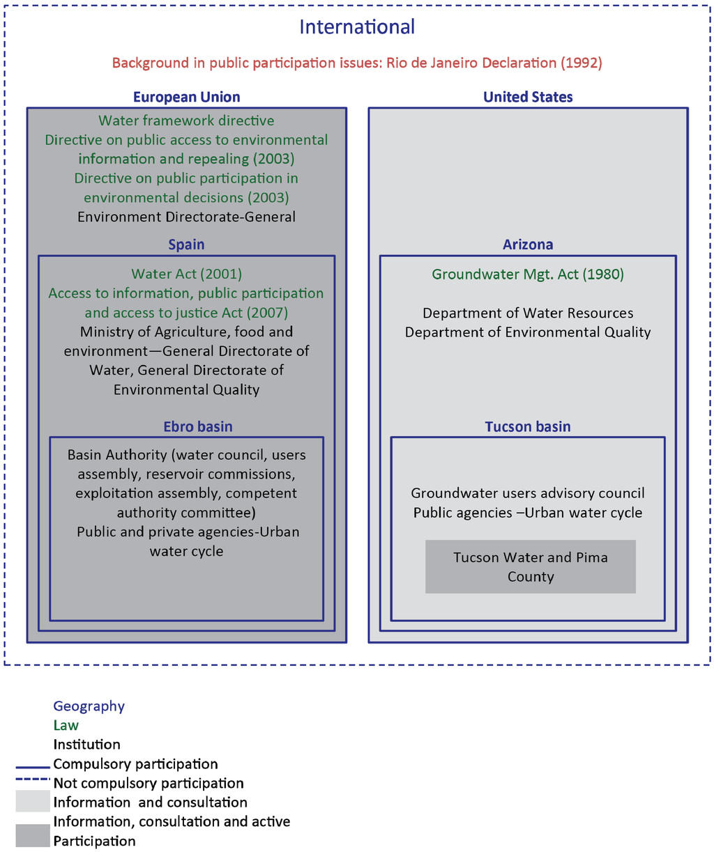 Legal and institutional frameworks for water management and public participation in Ebro and Tucson basins.
