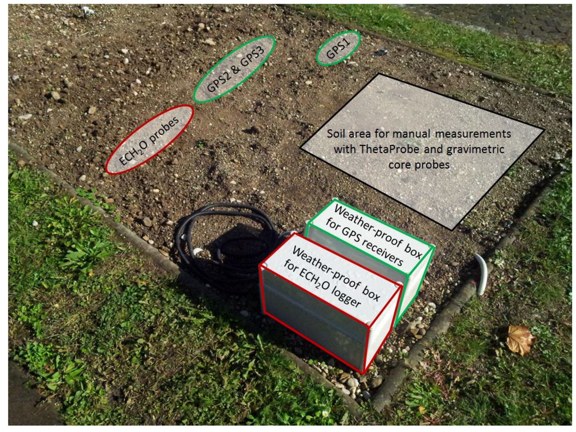 The DWD test site Munich is suitable for soil measurements by GPS. Within a radius of approximately 20 m, the test site is free from surrounding obstacles like houses or trees and allows relatively undisturbed GPS measurements for a city location. We installed three low-cost GPS sensors at the vegetation-free DWD soil measurement field (see Figure 1). One sensor (GPS1) was mounted directly on top of the soil and the other two sensors (GPS2 and GPS3) were installed at a depth of 10 cm within the soil column and were displaced horizontally to avoid being obstructed by the top one. The reason why we installed two GPS sensors in the soil is for redundancy purposes because maintenance of buried sensors is difficult under running conditions and to verify their high correlation, as stated in Section 3.2.