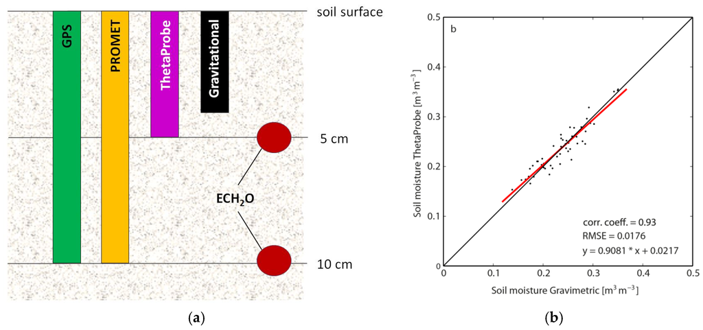 (a) Vertical location and measurement range in the soil column of the different methods to derive soil moisture; (b) Validation of ThetaProbe soil moisture readings by comparison with gravimetric measurements at the DWD test site in Munich during numerous field campaigns over the measurement period 1 January 2014–10 June 2015.