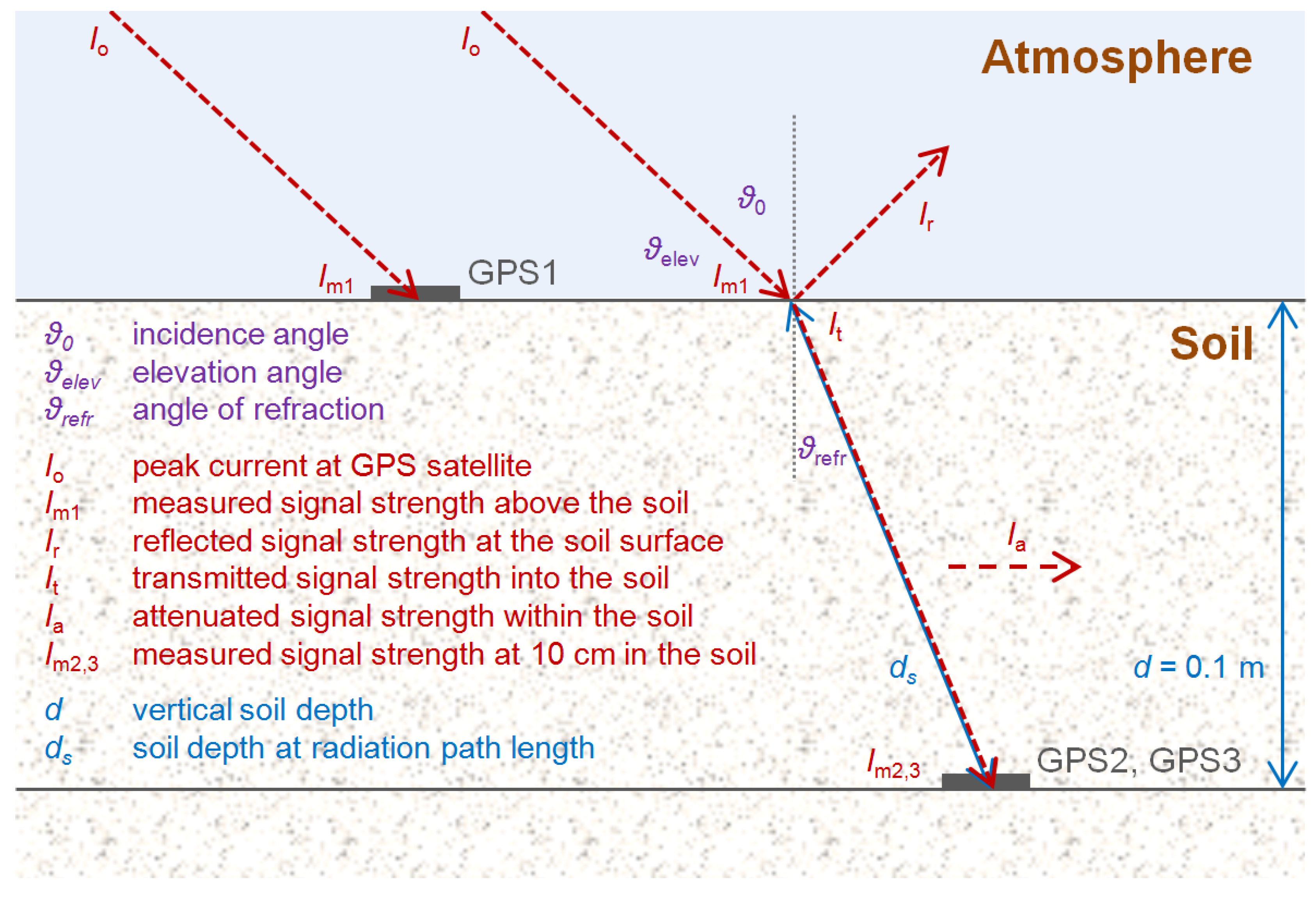 Overview of influences on the measured GPS intensity and radiation path length through the soil column, as well as the angle changes due to reflection, refraction and attenuation processes according to Koch et al. [37]. Only the direct signal paths are shown for one satellite at a specific elevation (in red).