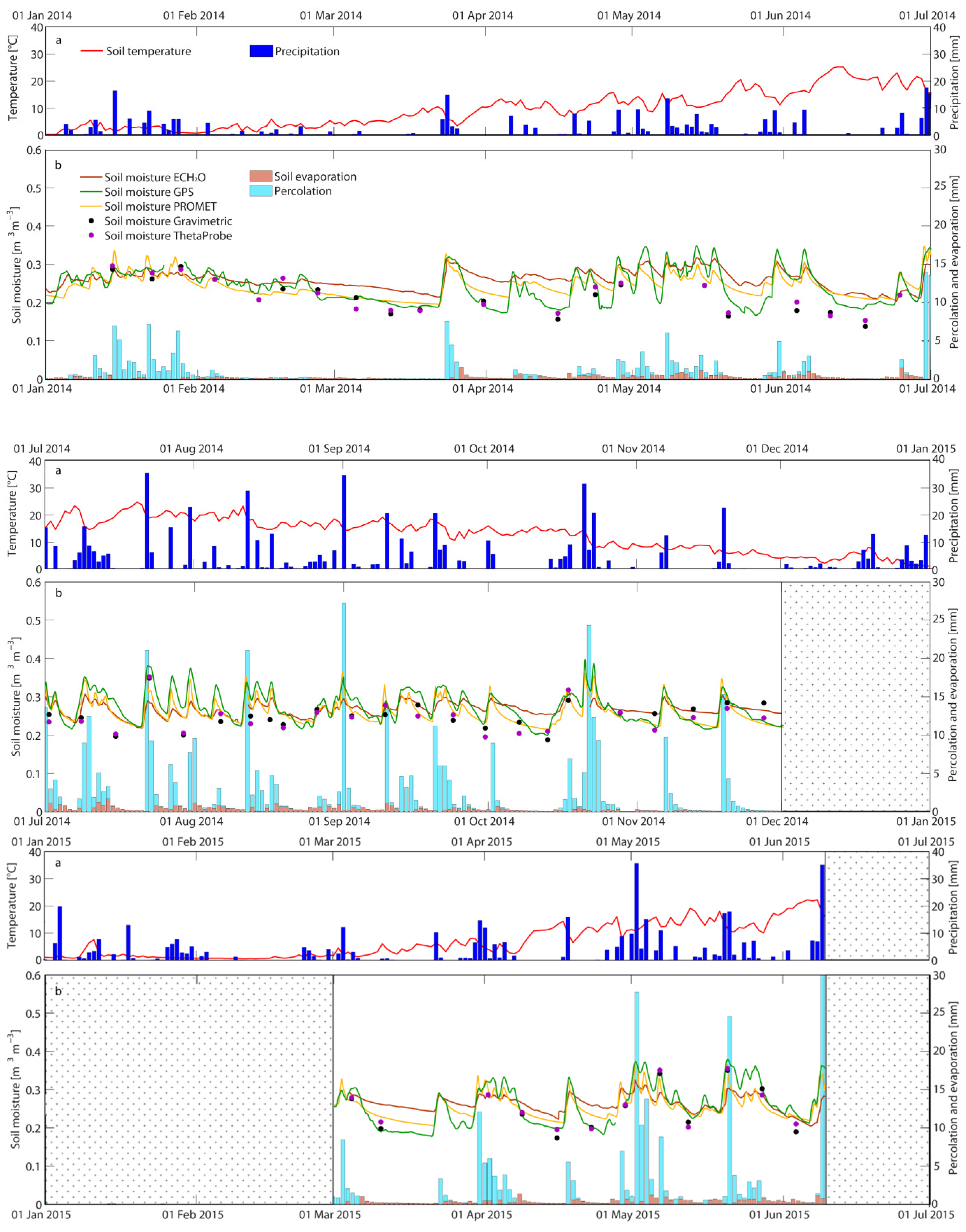 In Figure 4a,b, regarding all methods, a direct relationship between SM increase and occurrence of percolation is obvious after precipitation events, when water infiltrated into the soil. This is especially the case after 1 July 2014. However, comparing the three continuous methods, the increase in SM of the ECH2O probes is slightly lower, whereas for GPS more pronounced, PROMET is again in between. During periods with no or low percolation, SM declines slowly. Again, the GPS SM shows the clearest decline, followed by PROMET and then by the ECH2O probes. The first six months of the measurement period (January–June 2014) were rather dry with only few light rainfall events. Consequently, as the temperatures started to rise in March 2014, SM declined especially in the upper four to five centimetres as the manual ThetaProbe and gravimetric measurements show. Considerable dry periods occurred besides the first six months as well as in November 2014 and March to May 2015.
