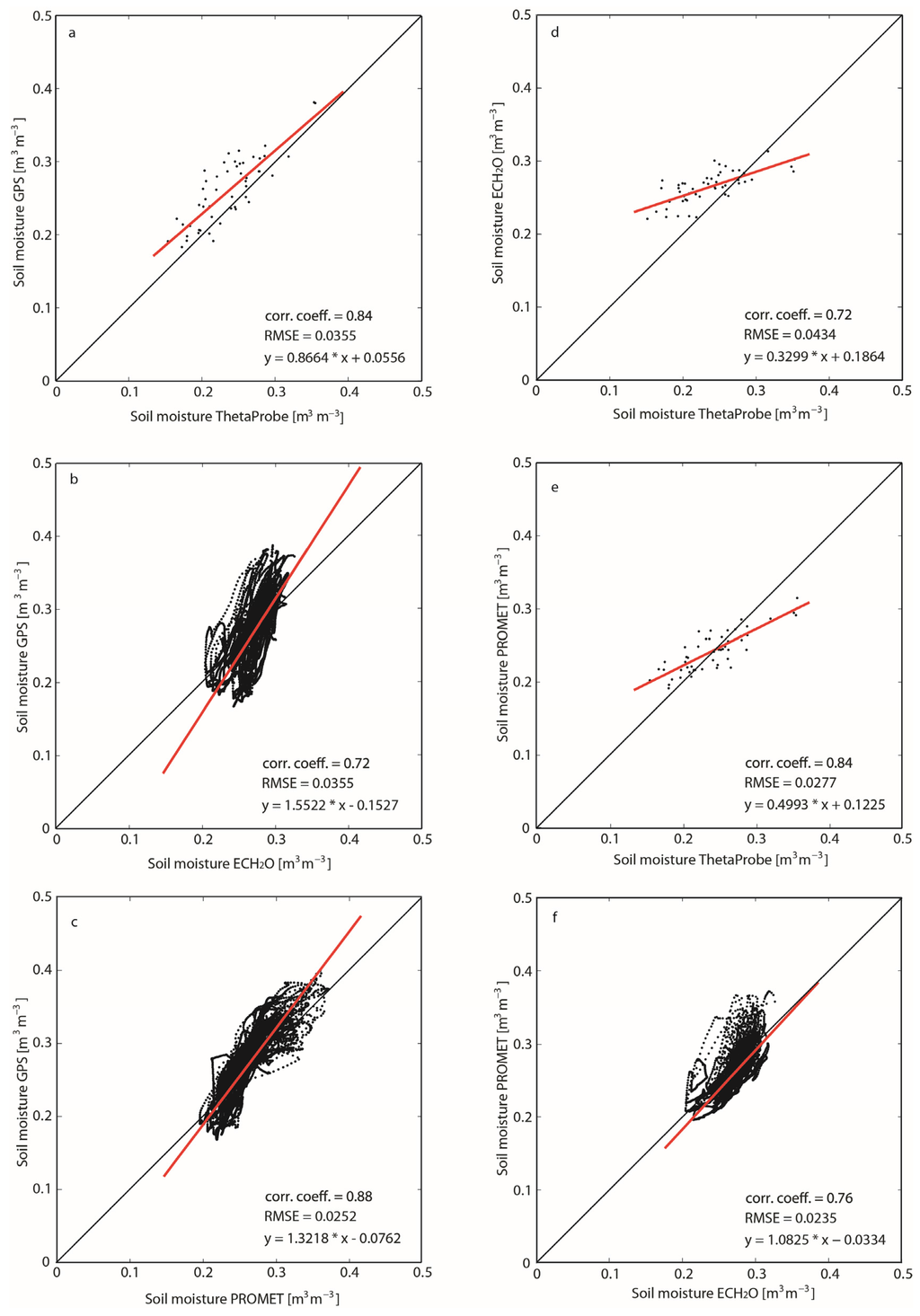 As Figure 2b indicates, the manual surface SM measurements encompassing the gravimetric method and ThetaProbe show high correlation. As all comparisons with the gravimetric method and all other methods would show similar results compared to the ThetaProbe, they are therefore not explicitly shown as scatter plots in the following. The six scatter plots in Figure 5a–f as well as the correlation coefficient and the RMSE in Table 4 show all variants of comparisons between GPS, ECH2O, PROMET and ThetaProbe SM.