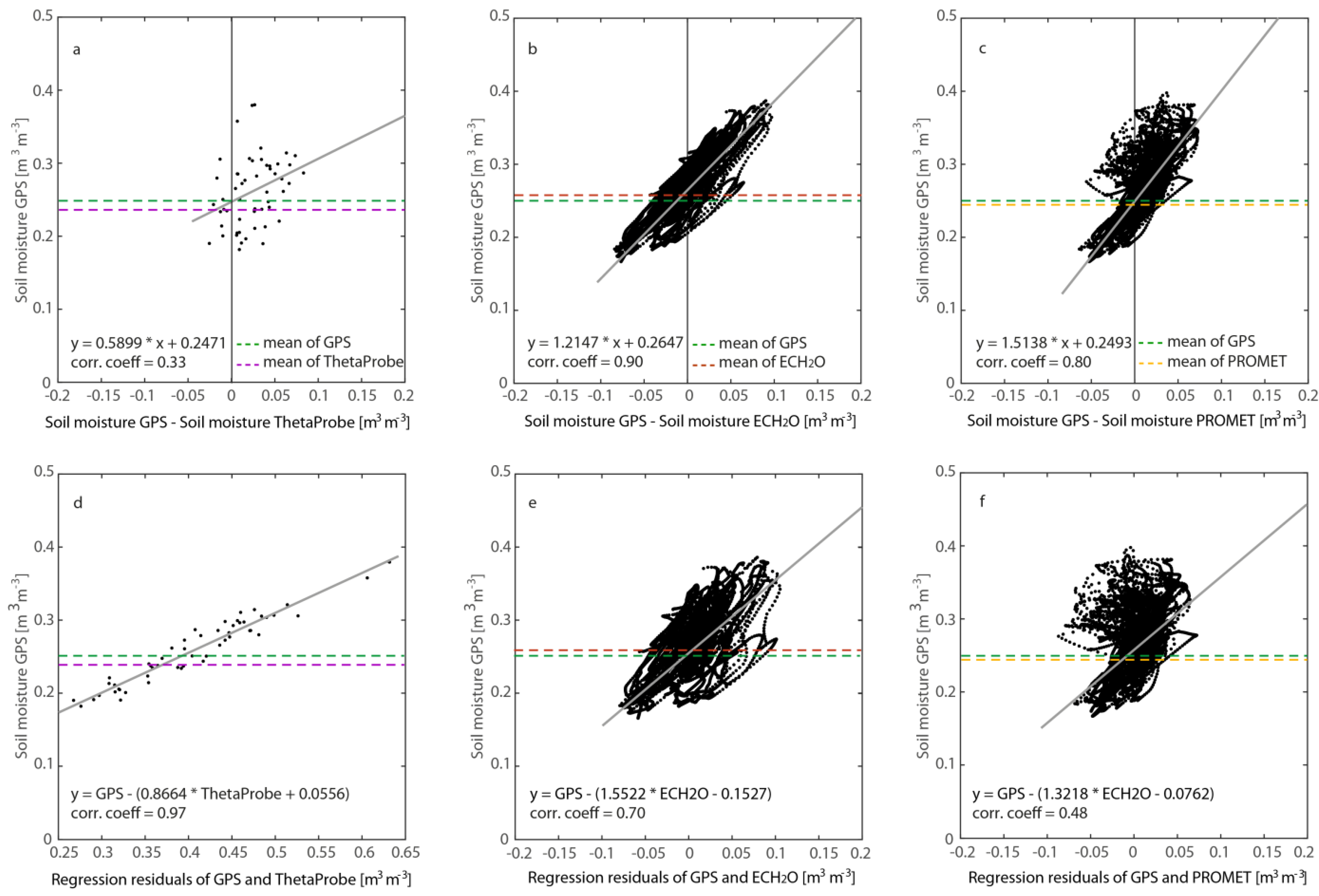 Comparison of soil moisture derived by GPS with the difference between (a) GPS and ThetaProbe; (b) GPS and ECH2O; and (c) between GPS and PROMET as well as with the regression residuals between (d) GPS and ThetaProbe; (e) GPS and ECH2O; and (f) between GPS and PROMET. The linear regression equations to calculate the residuals for each method compared to GPS were taken from the information given in Figure 5a–c, respectively.