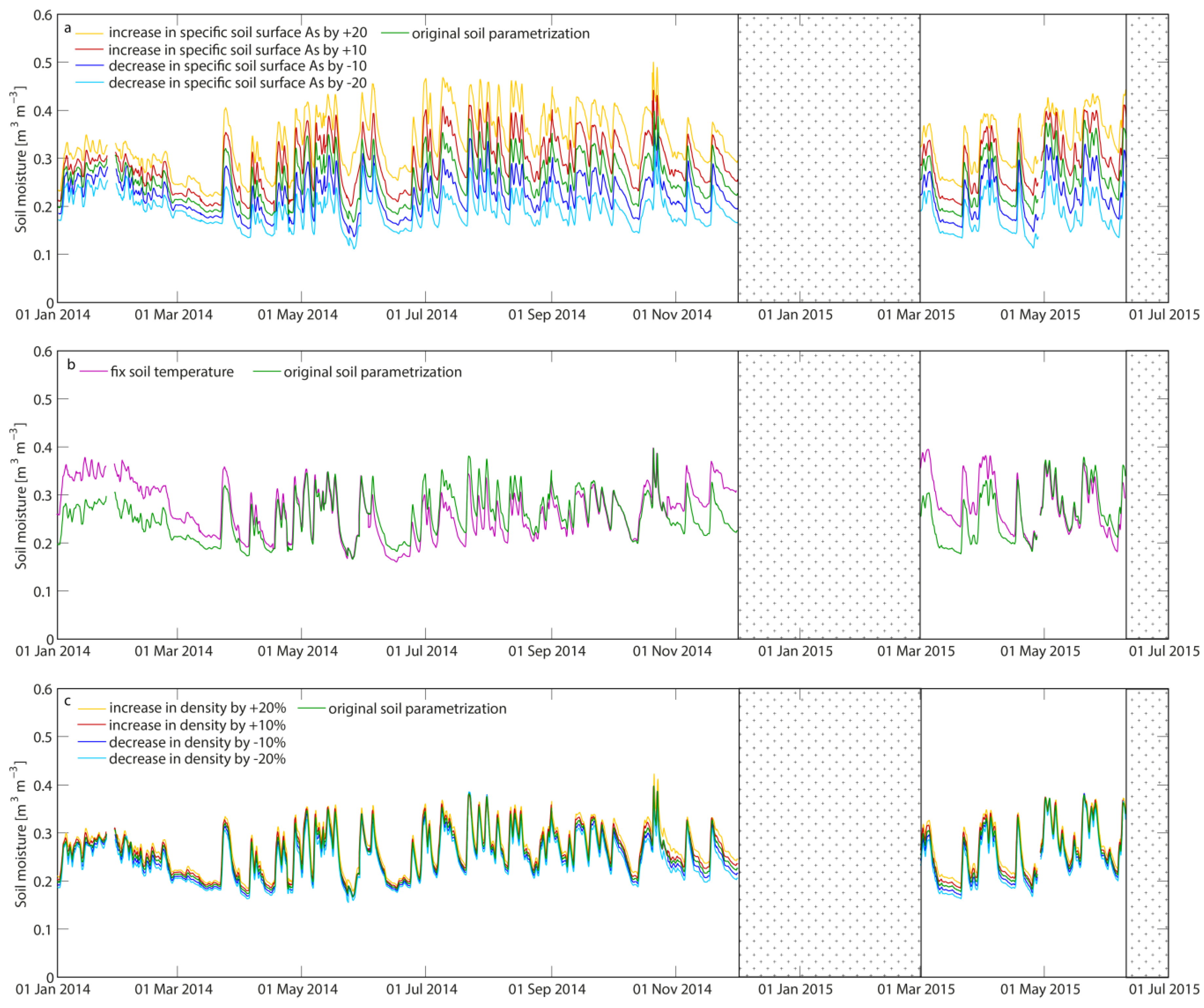 Soil moisture derived from GPS containing different assumptions on (a) an increase or decrease of the specific soil surface , which is an indicator for different soil texture assumptions of and ; (b) a fixed soil temperature assumption of 15 °C and (c) a soil density over- and underestimation of and compared to the original parameterized calculations at the DWD test site in Munich during the measurement period 1 January 2014–10 June 2015.
