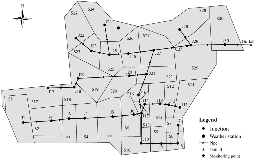 The study area is located in Beijing, China, which has a sub-humid continental monsoon climate with a mean annual temperature of 12 °C and a mean annual precipitation of 626 mm (80% of which falls from June to September). The study area is a university campus that includes buildings, lawns, and roads, and is relatively flat with a ground elevation difference of 0.5 m. The drainage area of the catchment is 3.8 ha, and approximately 76.5% of the catchment area is impermeable (1.62 ha of roads and 1.29 ha of buildings). The study area was divided into 30 sub-catchments (denoted S1 to S30 in Figure 1) for the stormwater management model (SWMM) model simulation. The areas of the 30 sub-catchments range from 0.03 ha to 0.31 ha. The percentages of roads, buildings, and green areas (lawns) in the 30 sub-catchments range from 8% to 83%, 0% to 76%, and 0% to 63%, respectively. The study area has gentle slopes ranging from 0.2% to 0.66%. There are 30 underground stormwater pipes with junctions (J1 to J30) connecting the 30 sub-catchments to a single outlet (Outfall in Figure 1) in the catchment.