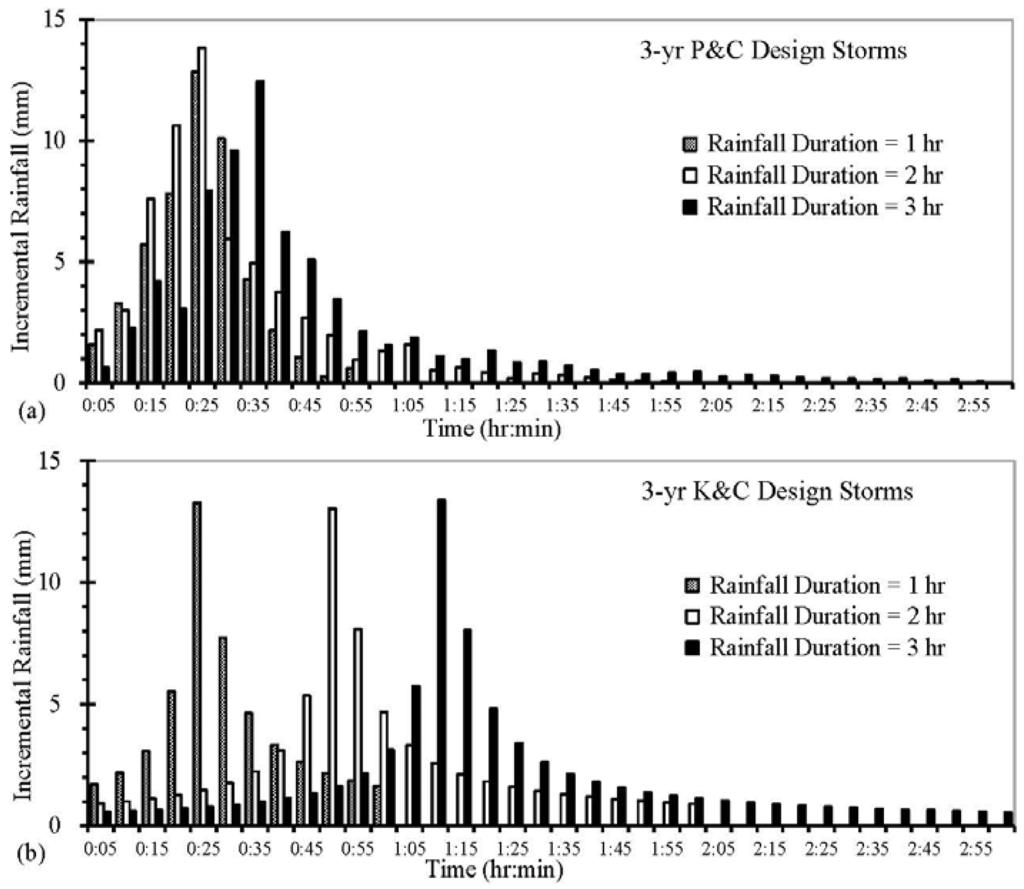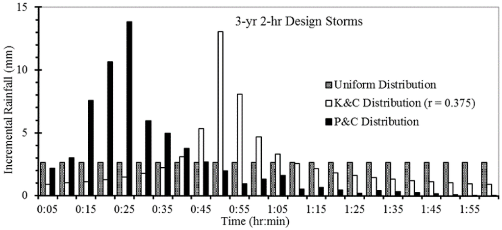 Figure 2 shows three rainfall patterns used in SWMM model simulations for a three-year return period, 2-h duration storm. The total design rainfall depth for the three-year, 2-h event in Beijing is 63.4 mm (Equation (3)). The rainfall occurring in 5-min intervals was used as input for SWMM modeling. For the K&C and P&C distributions, peak 5-min incremental rainfalls are 13.04 mm and 13.83 mm, respectively, and occur at 45–50 min and 20–25 min, respectively (Table 2). These rainfall distributions are classified as second- and first-quartile storms based on the location of the storm peak within the distributions [].