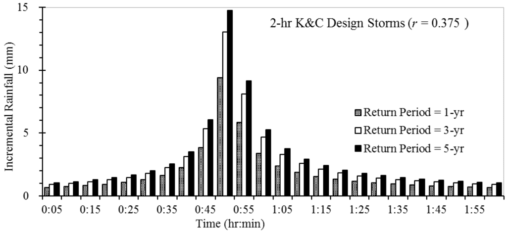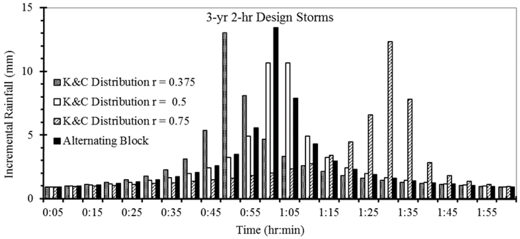 Figure 3 shows rainfall patterns calculated using the Beijing K&C distributions with r = 0.375, 0.5 and 0.75, as well as using the alternating block rainfall distribution, for a three-year 2-h design storms []. For r = 0.375, 0.5 and 0.75, the K&C method produces peak 5-min incremental rainfalls of 13.04 mm, 10.66 mm, and 12.34 mm, respectively, which occurs at 45–50 min, 55–65 min (two peaks), and 85–90 min, respectively. The alternating block method is often used in the USA for developing hyetographs for design storms [], and is similar to the K&C method in that it utilizes average rainfall intensities calculated from a local IDF curve. The highest rainfall is assumed to occur at the mid-point of the design storm duration (13.44 mm at 55–60 min in Figure 3), and the remaining blocks of rainfall are arranged in descending order from the center block to the right and left [].