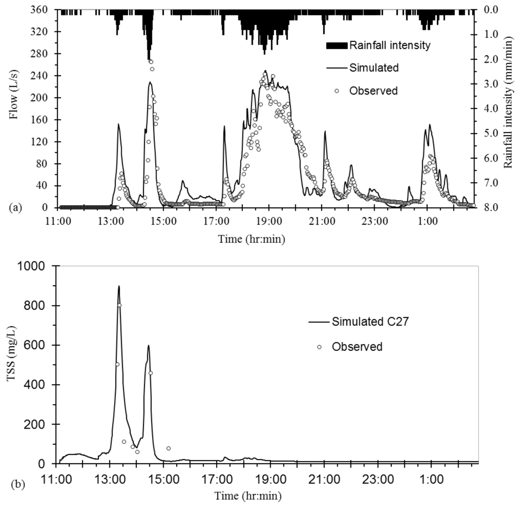 Developed SWMM model was calibrated and validated for flow rate (L/s) and TSS concentration (mg/L) at the end of the conduit C27 (Figure 1) using measurements from two rainfall events: 21 July 2012 (Figure 6) and 7 June 2013 (Figure 7), respectively. The number of dry days before the event on 21 July and 7 June were 10 d and 3 d, respectively. The calibrated Manning’s roughness coefficients for underground pipelines, impervious and pervious surfaces were 0.013, 0.011, and 0.15, respectively. Calibrated depression storage for impervious and pervious surfaces was 2 mm and 12 mm, respectively. Horton’s equation [] was used for infiltration computation of pervious surfaces, resulting in a maximum infiltration rate of 103.81 mm/h, an equilibrium infiltration rate of 11.44 mm/h, and a decay constant of 8.46 h−1.