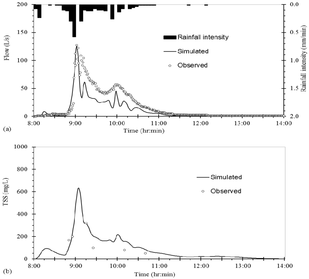 Simulated and observed flow (L/s) (a) and TSS concentration (mg/L) (b) for the SWMM model calibration on 21 July 2012 including observed rainfall hyetograph.