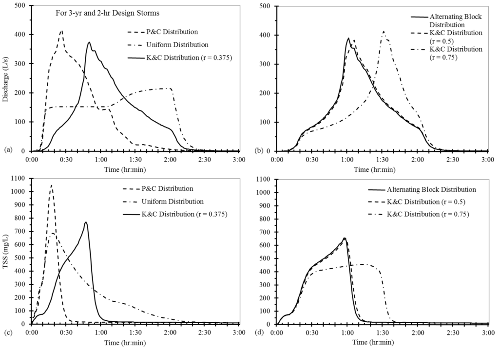 (3) The three-year P&C design storms with 1-, 2-, and 3-h durations were developed from long-term heavy rainfall events in Beijing and have dissimilar rainfall distributions (e.g., different locations of peak rainfall with respect to the duration). The 1-h and 3-h P&C distribution design storms result in lower peak discharge and TSS concentration, but higher outlet TSS load than 2-h storm does, because of lower TSS losses due to flood deposition (29.1% and 27.1%). The resulting hydrographs and TSS pollutographs for 1-, 2-, and 3-h K&C distribution design storms with a three-year return period have consistent patterns because the three K&C distributions have the same peak location constant (r = 0.375) for the second-quartile storms.
