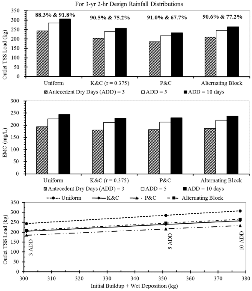 Results presented in Figure 8 and Table 5 were developed under the assumption of five antecedent dry days for all design storms in SWMM modeling. A sensitivity analysis was conducted using four design rainfall distributions to examine the effect of antecedent dry days (three days and 10 days); comparative results of the simulated outlet TSS loads and EMCs are given in Figure 9. As described in Section 3.1, the three-day and 10-day antecedent dry periods were happened for the 7 June 2013 model-validation event and the 21 July 2012 model-calibration event. The three and 10 dry days result in initial buildups of 276.8 kg and 353.8 kg TSS, respectively (Table 4). Because the volume of rainfall is the same for the four distributions, so is the mass of TSS in wet deposition (24.1 kg). Both the outlet TSS load and EMC have perfect linear correlations with the available sediment for transport (initial buildup plus wet deposition); this result can be explained using Equation (2) when discharges produced by the design rainfall are the same for three sensitivity model runs and assuming three antecedent dry days. In Figure 9, two percentages are given above the bars of the outlet TSS load for each design rainfall distribution. The first of these percentages is surface runoff TSS as a percentage of total available sediment for washoff or transport. The second percentage is the outlet TSS load as a percentage of surface runoff TSS. These two percentages for an assumption of five antecedent dry days are given in Table 4. Data shown in Figure 9 and Table 4 reveal that the two percentages are exactly the same for all three antecedent dry-day periods. The product of these two percentages gives the outlet TSS load as the percentage of total available sediment. Of the four rainfall distributions, the uniform design storm transported the highest percentage (81.1% = 88.3% × 91.8%) of total sediment because it yields the lowest TSS flood loss (8.2%), although runoff from the uniform rainfall has the lowest capability (88.3%) to wash off sediment. The P&C design storm transports the lowest percentage of total sediment (61.6%) because 32.3% of TSS load (i.e., 100%–67.7%) is trapped by surface flooding.