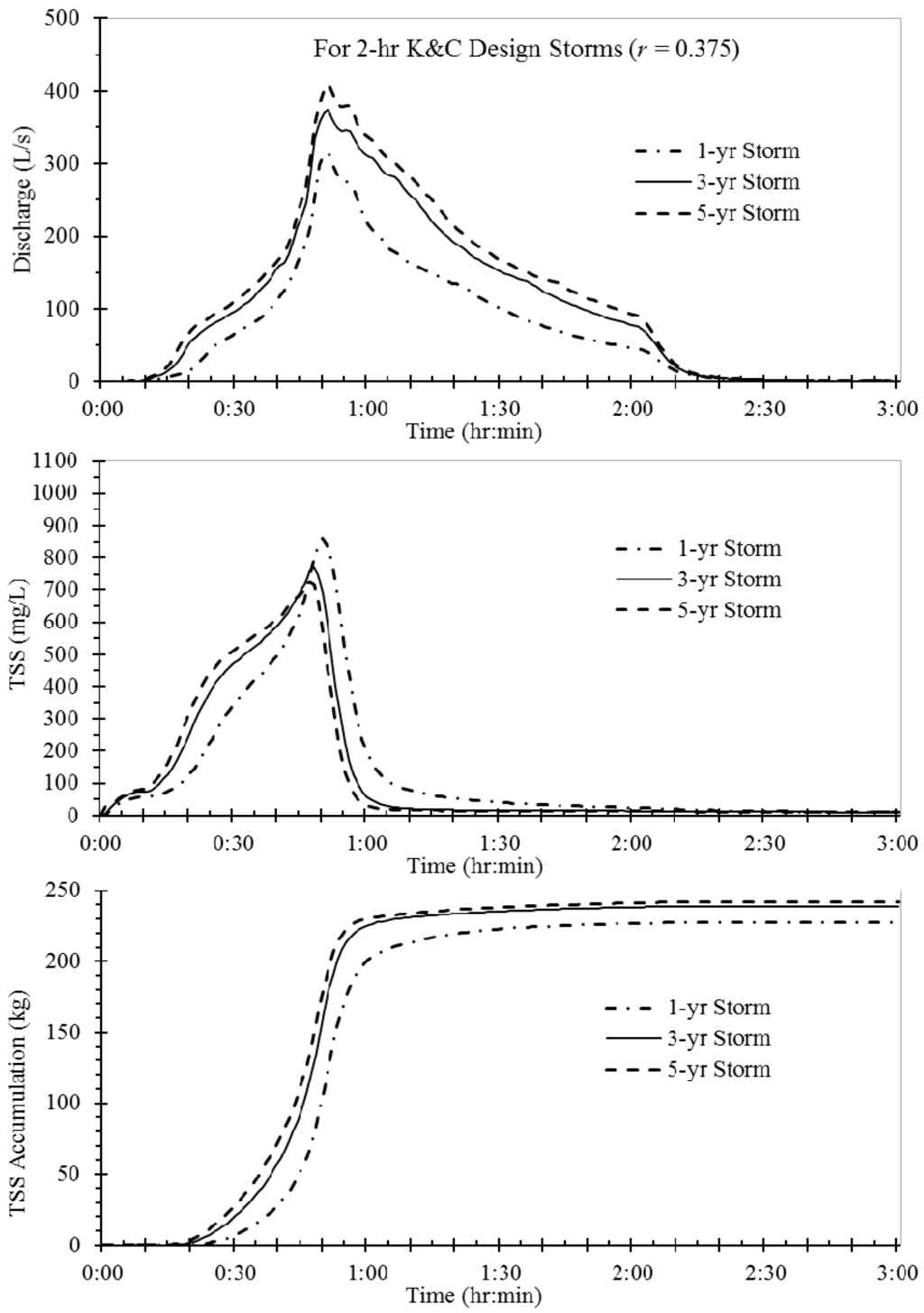 Summary of simulated flow and TSS concentration characteristics for the 2-h K&C design storms (r = 0.375) with three different return periods.