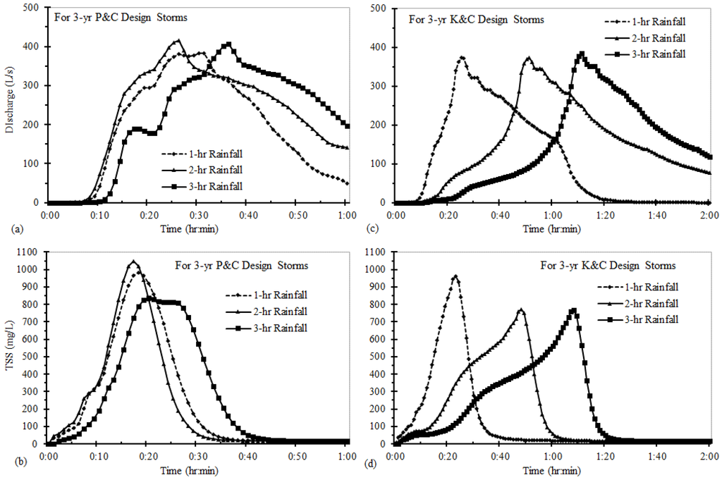 The resulting hydrographs and TSS pollutographs for 1-, 2-, and 3-h K&C distributions of rainfall from a three-year design storm has consistent patterns. Peak discharges and outlet TSS loads increase while peak TSS concentrations and the outlet EMCs decrease as the storm duration increases (Table 7). Likewise, the TSS time base increases from 42 to 81 min as design storm duration increases from 1 h to 3 h because these K&C distributions (Figure 5) have the same peak location constant (r = 0.375) and are similar second-quartile storms. For P&C distributions of three durations, the peak location with respect to total rainfall duration is not constant; therefore, simulated hydrographs and TSS pollutographs are not similar from one duration to another of P&C distributions.