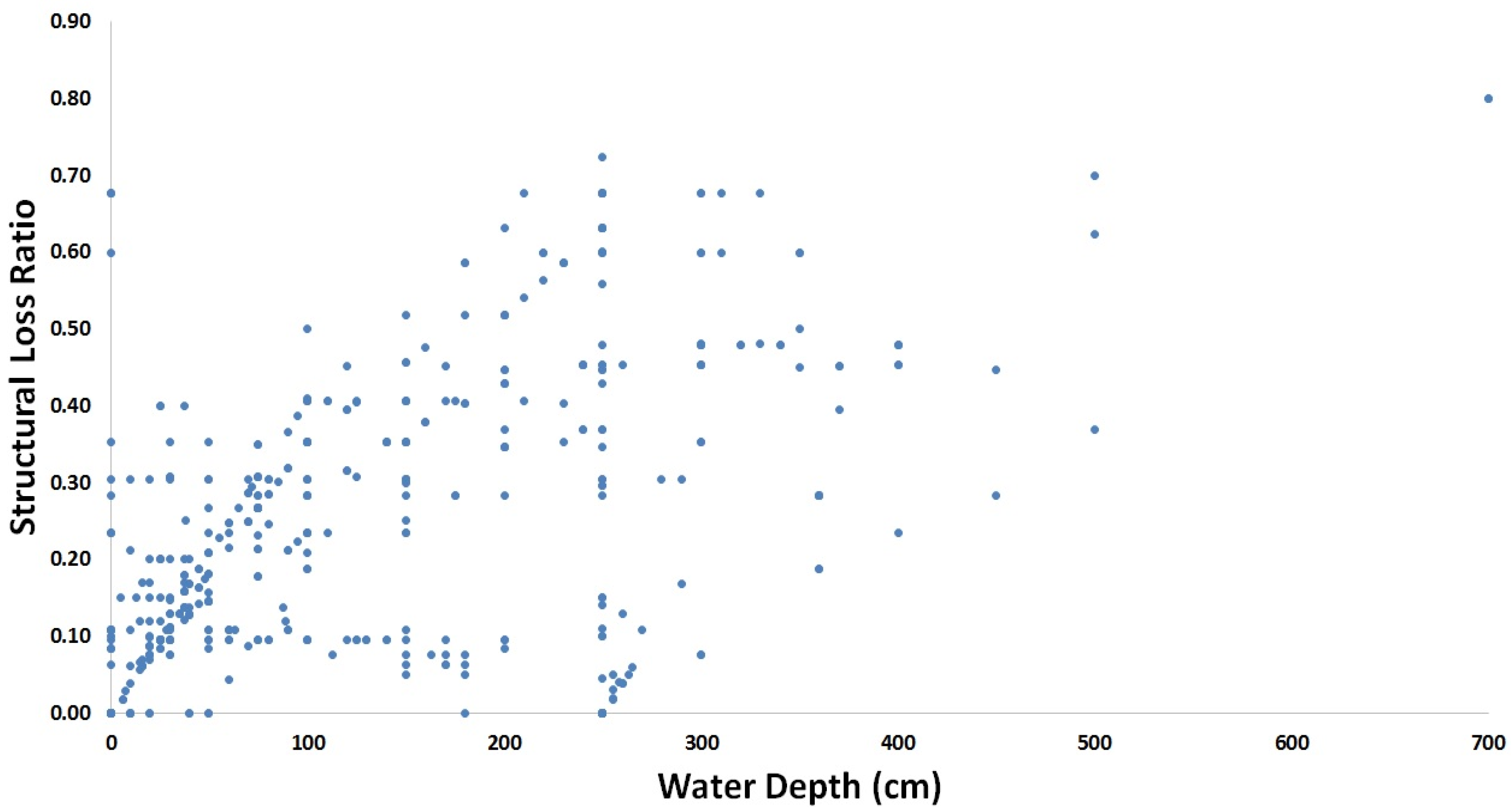 Figure 7. Scatter plot showing the relation between loss ratio and water depth (structural loss ratio does not cover the damages of mobile contents, and it is only limited to all building fabrics including stationary interiors).