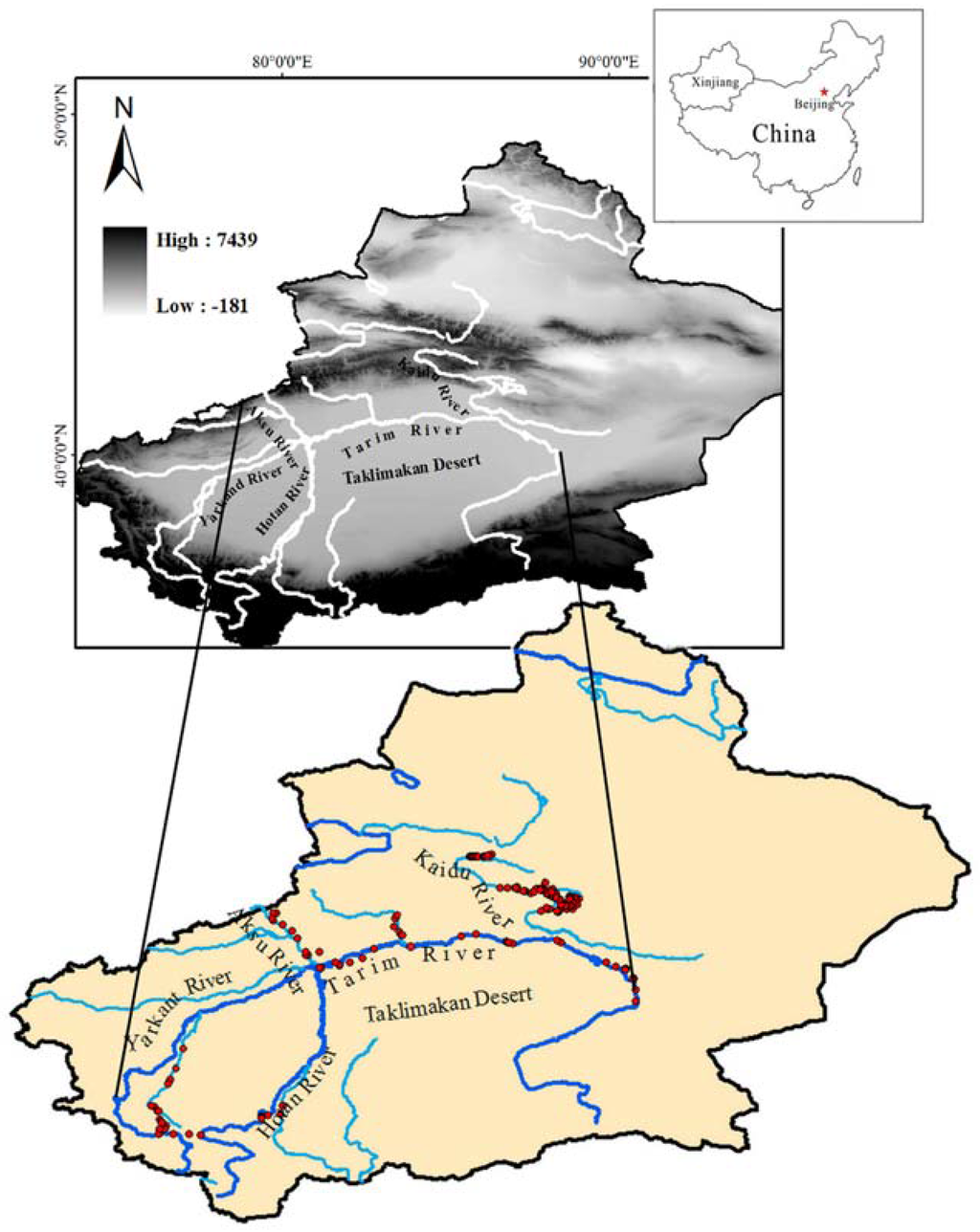 The landforms of the Tarim River Basin include mountains (47%), plains (22%), desert (31%), and an arable land area of 1.36 × 106 km2 (Figure 1). The Aksu River, Yarkand River, and Hotan River join the Tarim River in the upper reaches, while the Kaidu River flows into the Tarim River in the lower reaches [19]. The Tarim River Basin is the largest inland river basin in China; the majority of the basin is located in Xinjiang, the largest provincial administration unit of China, and occupies about two-thirds of the total area of Xinjiang [20]. The Tarim River is about 1321 km long, from the confluence composed of the Aksu, Hotan, and Yarkand Rivers to Taitema Lake [21].