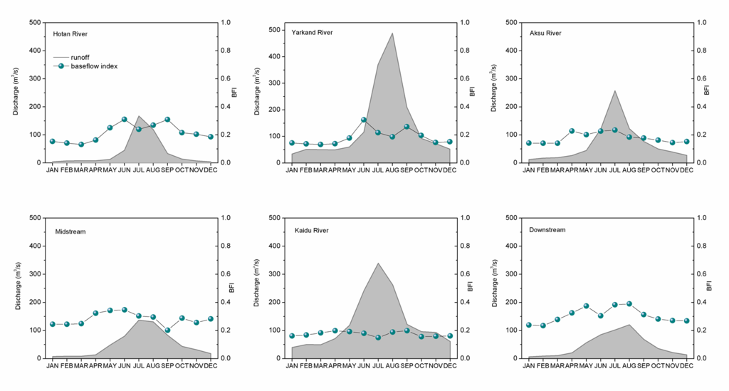 Monthly variations of runoff and baseflow index in the Tarim River Basin. Data for runoff is from last 30 years and data for baseflow index is from 1972 to 2007.