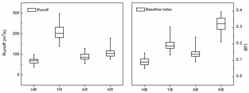 Box plots of spatial variations for runoff and BFI. Data sites were in the Hotan, Yarkand, Aksu, and Kaidu Rivers. The box plot has lines at the lower quartile, median, and upper quartile values. The whiskers of the box are lines extending from each end of the box to show the extent of the rest of the data. The outliers of the box are data with values beyond the ends of the whiskers.