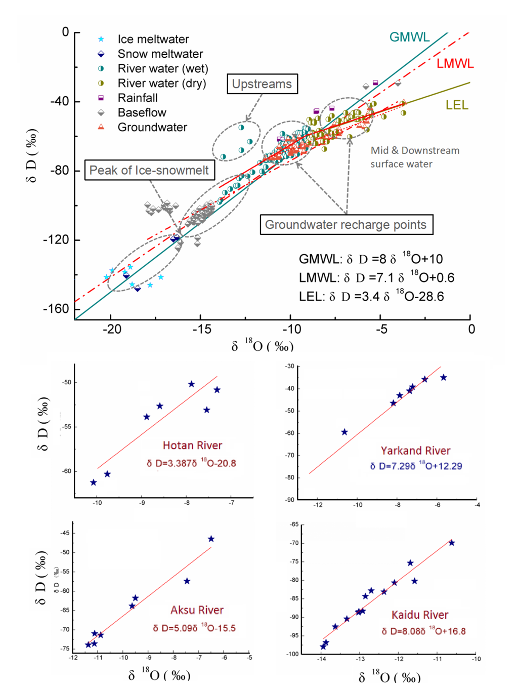 Water components’ relationship displayed by the bivariate plot of δD versus δ18O in Tarim River Basin, with river water, precipitation, ice-snowmelt water and groundwater relative to global meteoric water line (GMWL) [25] and local meteoric water line (LMWL) [26]. The isotopic composition of the surface water is plotted on a local evaporation line (LEL). Surface water lines of the four headstreams were fitted.
