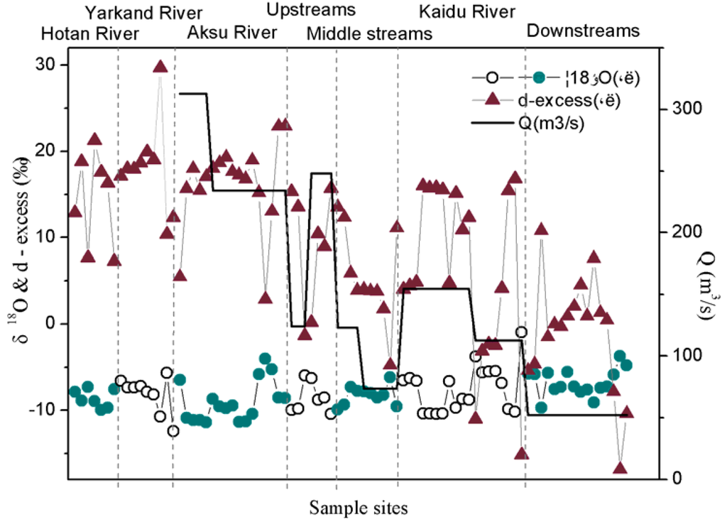 Time series of discharge (solid line, m3/s) in the whole Tarim River at the hydrological stations, and fluctuations of δ18O (circles, ‰) and d-excess (triangles, ‰) sampled from the deep river water (at least 30 cm below the surface of the water) near the wells.