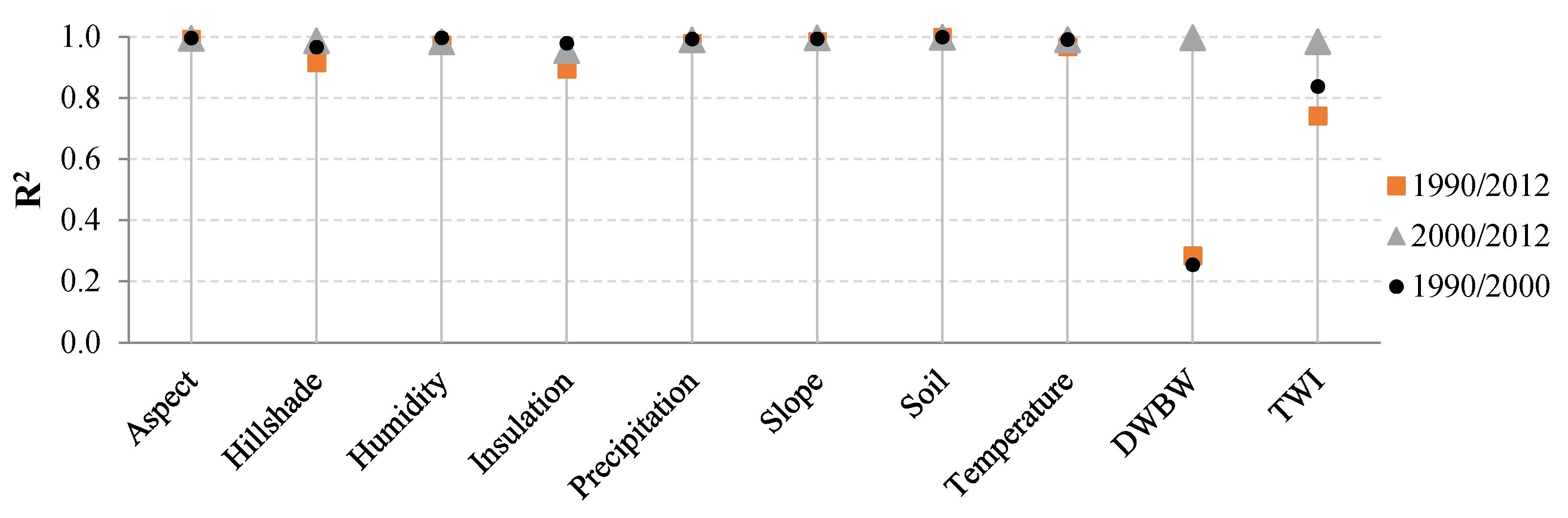 | Variables | Classes | Total Area (ha) | AS 1990 (ha) | AS 2000 (ha) | AS 2012 (ha) | CPji (AS 1990) | CPji (AS 2000) | CPji (AS 2012) | IV (AS 1990) | FM (AS 1990) |